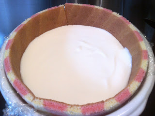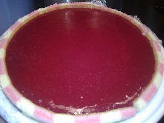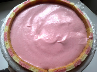 Ajouter le restant de coulis, le sucre glace, et verser sur la mousse framboise.