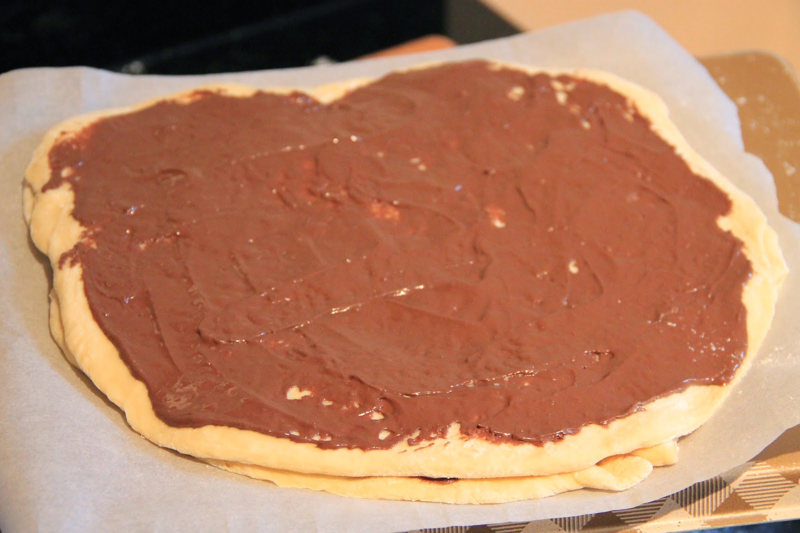 Placer le premier disque sur un papier sulfurisé et napper le de pâte à tartiner. Recouvrir d’un deuxième disque et garnir également.