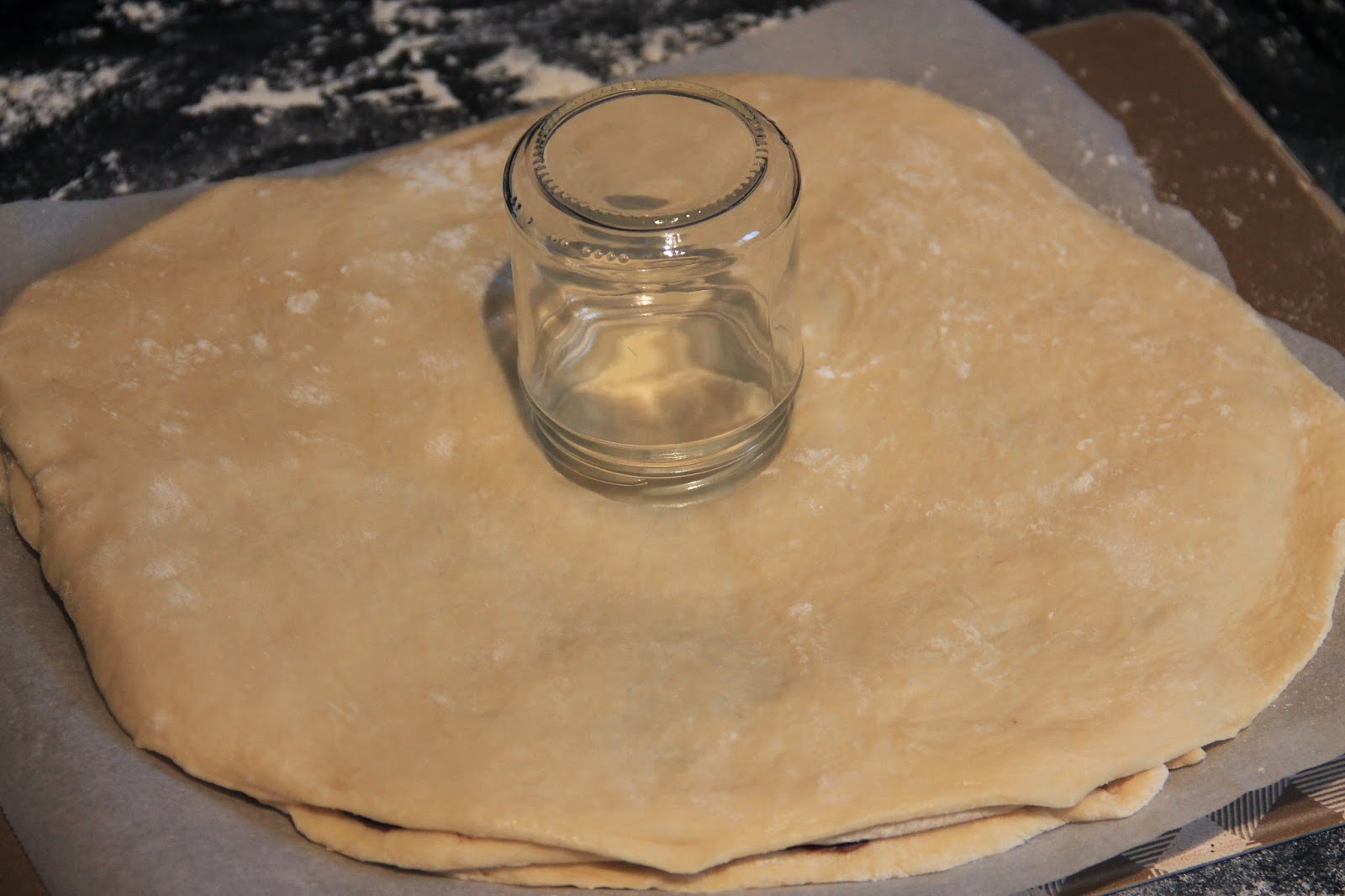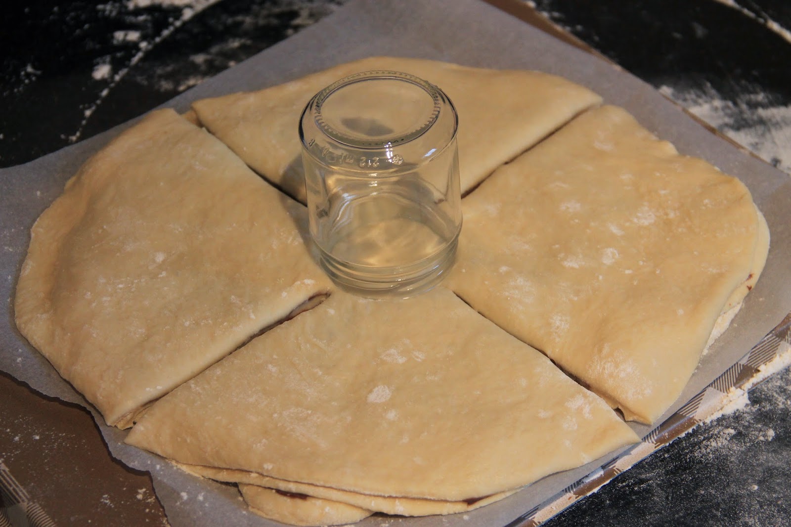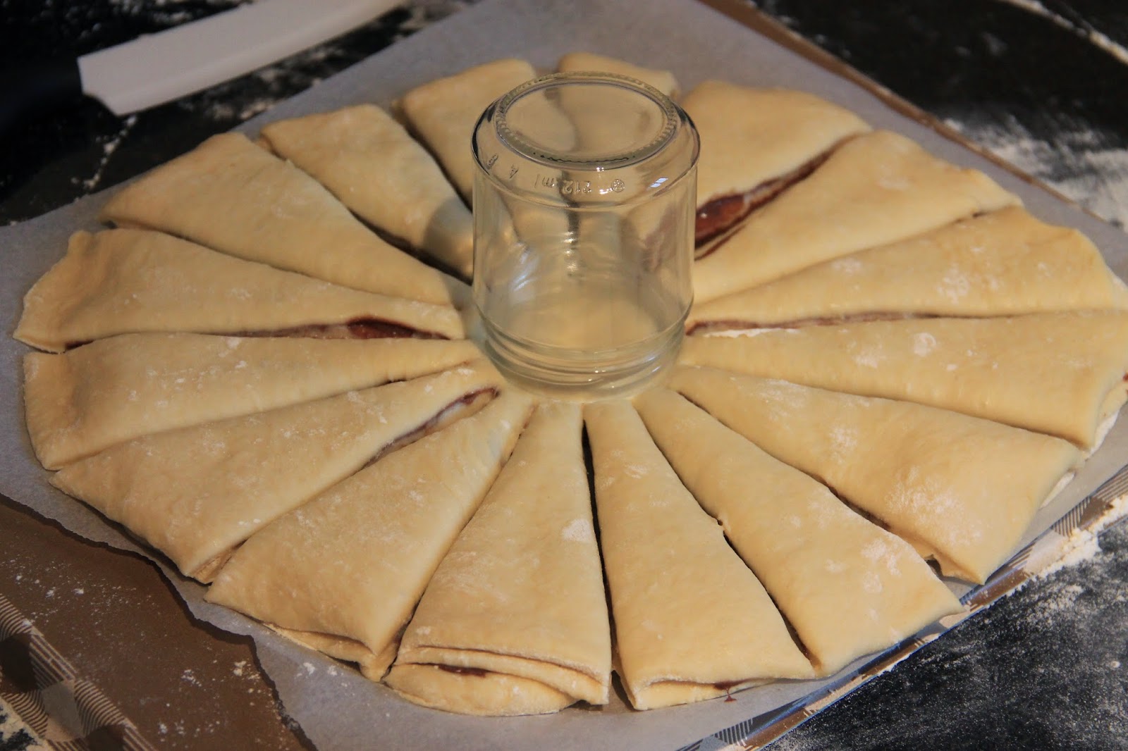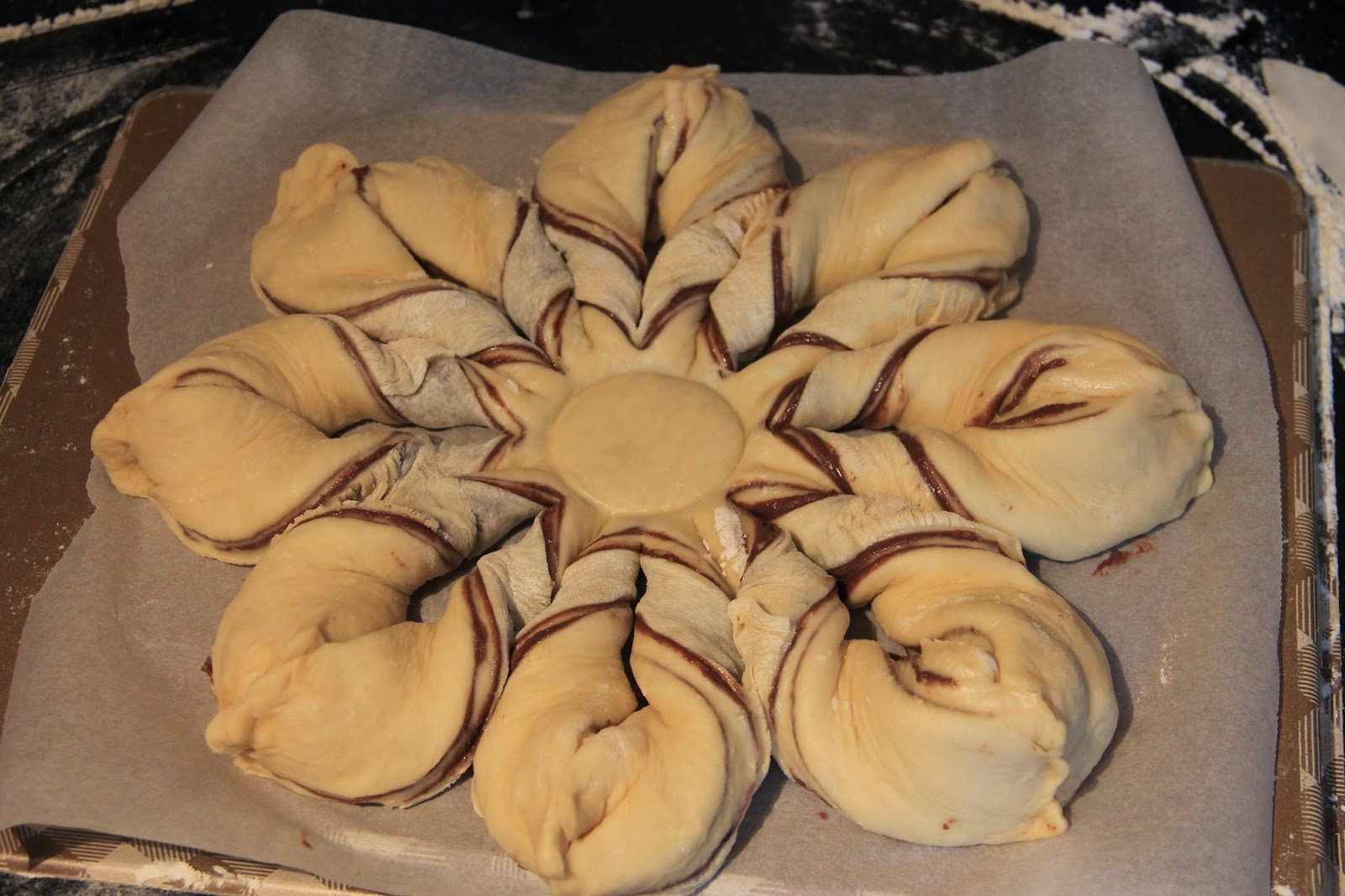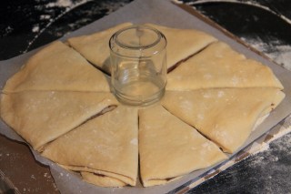 Prendre une part dans chaque main et les retourner les en même temps vers l’extérieur deux fois et pincer les extrémités pour bien pour les souder. Laisser pousser 30mn recouvert d’un film alimentaire.