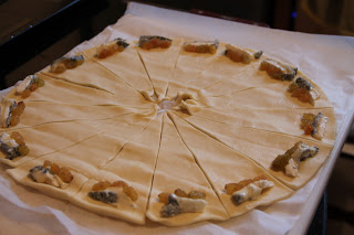 Couper le rouleau de pâte feuilletée en 16 morceaux, et garnir sur l’extérieur.
