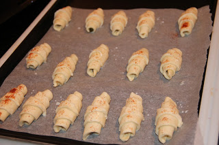 Rouler le croissant sur lui-même sans serrer. Badigeonner de lait et enfourner dans le four préchauffé à 220 C° jusqu’à ce que les croissants soient bien dorés. Laisser refroidir sur une grille.