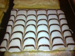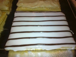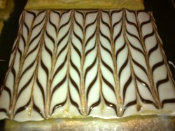 Napper la couche supérieure de glace royale et à l’aide de la poche à douille, tracer les lignes perpendiculaires de chocolat IMMEDIATEMENT. Tout doit s’enchaîner pour ne pas laisser le temps à votre glace royale de commencer à croûter.