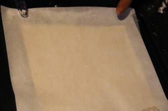 Déposer un pâte feuilletée sue une plaque de cuisson recouverte de papier sulfurisé. Piquer largement la pâte à la fourchette, et recouvrir de papier sulfurisé.