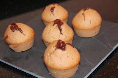 Déposer deux cuillères à soupe de pâte dans les moules à silicone. Ajouter 1 carré de chocolat dans le pâte puis recouvrir avec le reste de pâte. Remplir les moules aux 3/4.