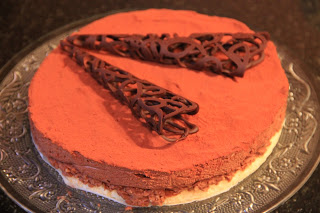 Décorer avec du cacao amer. (Mettre le cacao dans un chinois et tapoter avec votre main au dessus du gâteau, la répartition sera uniforme)