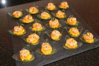 Dresser le chutney dans une coupelle, déposer une gambas et décorer avec un brin de ciboulette.