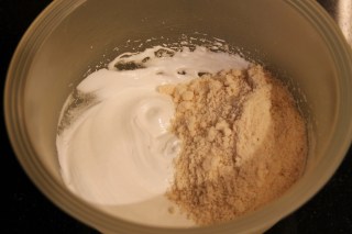 Lorsqu’ils sont fermes, incorporer à la spatule la poudre d’amande et 12 gr de noix de coco râpée.