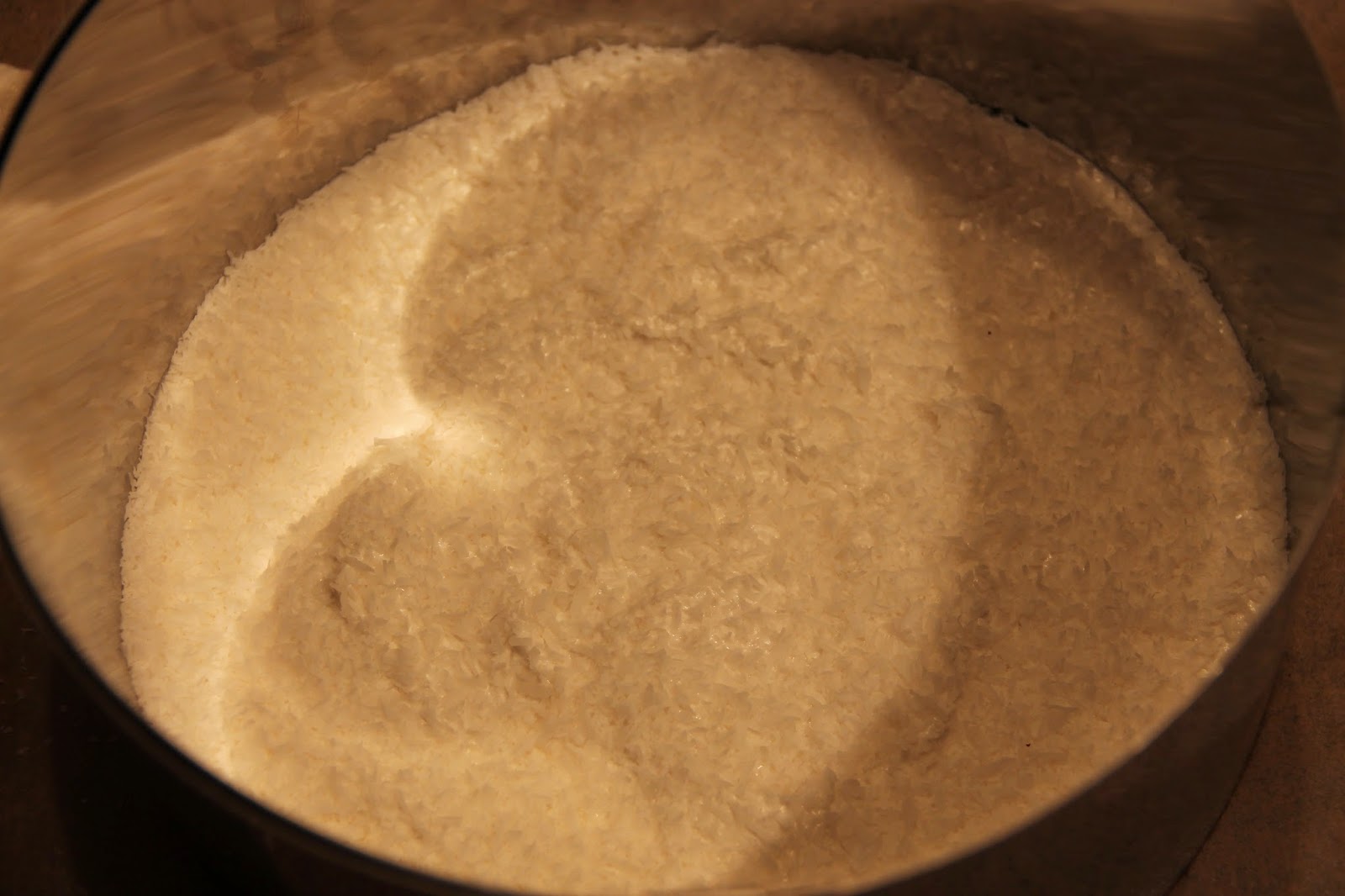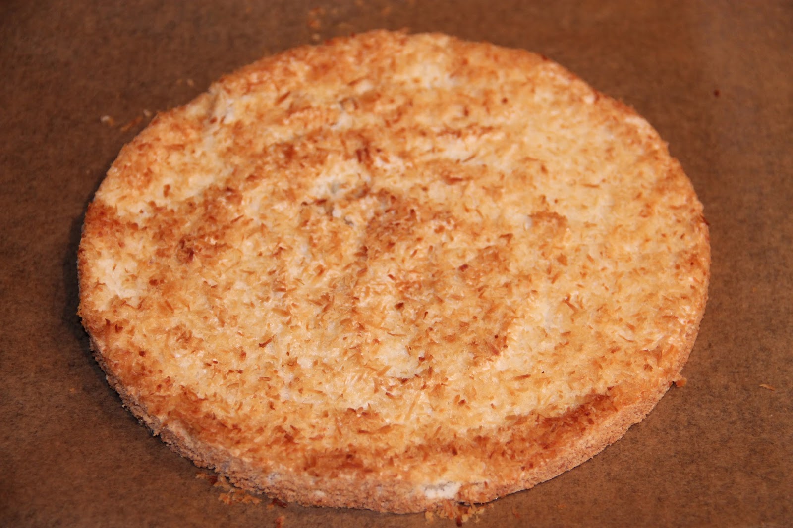 Mettre cette préparation dans un cercle de 18 cm de diamètre et saupoudrer avec le reste de la coco.
