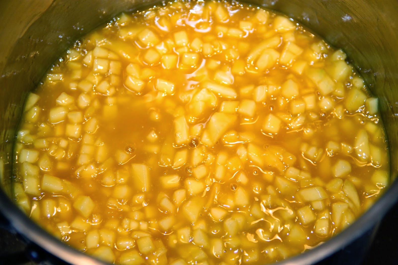 Faire compoter 5 min à feu doux avec le jus de mangue (et le sucre si besoin).