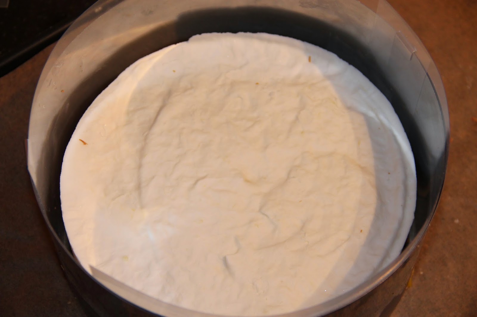 Remettre la dacquoise dans le cercle de 18 cm de diamètre après l’avoir chemisé de papier rhodoide.