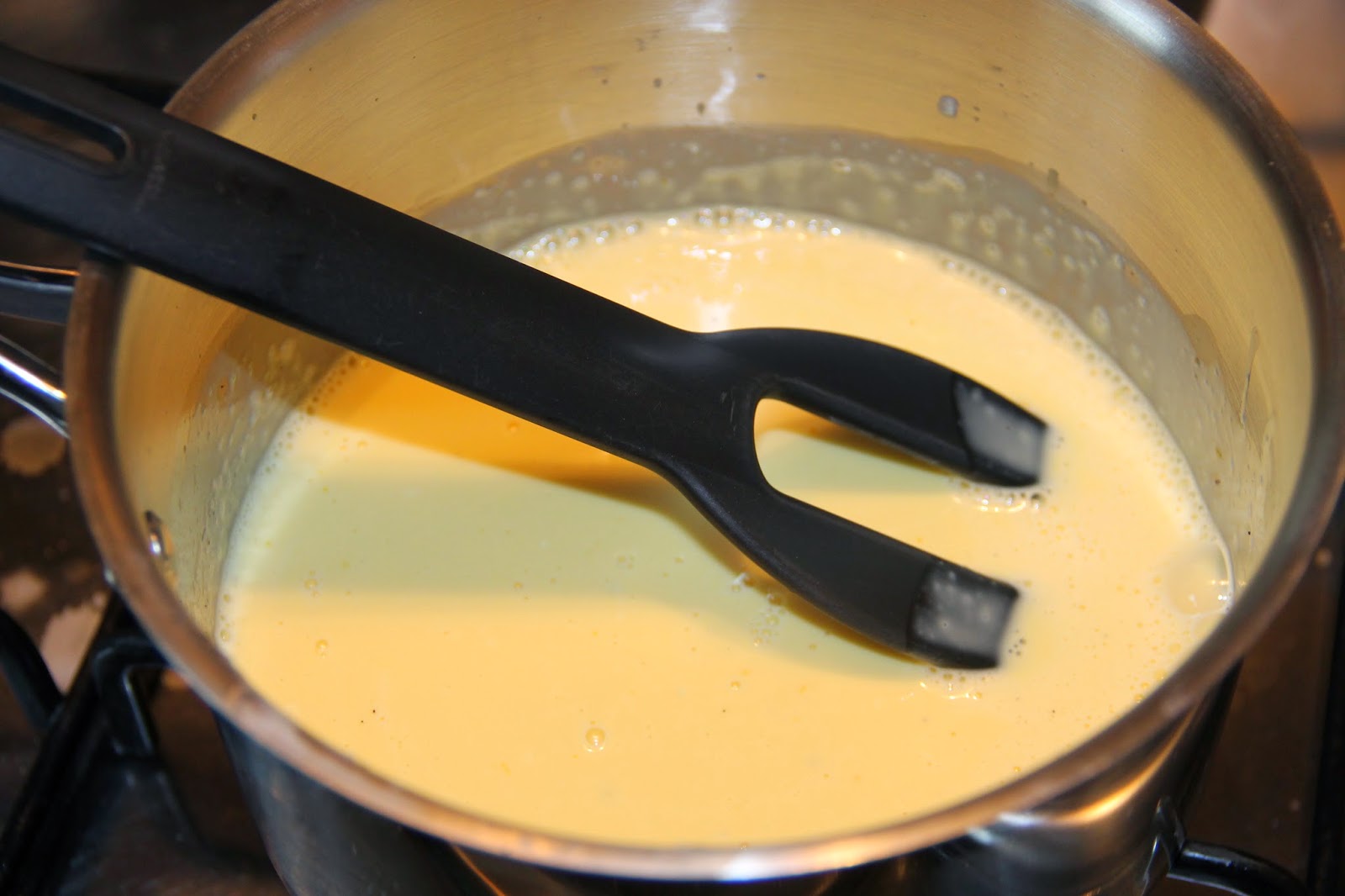 Verser la crème sur les jaunes blanchis et mettre sur feu doux sans cesser de remuer jusqu’à ce que la crème nappe la cuillère.