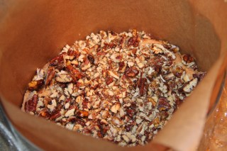 Quand les noix de pécan sont froides, détailler grossièrement au couteau et verser sur le financier noisettes.