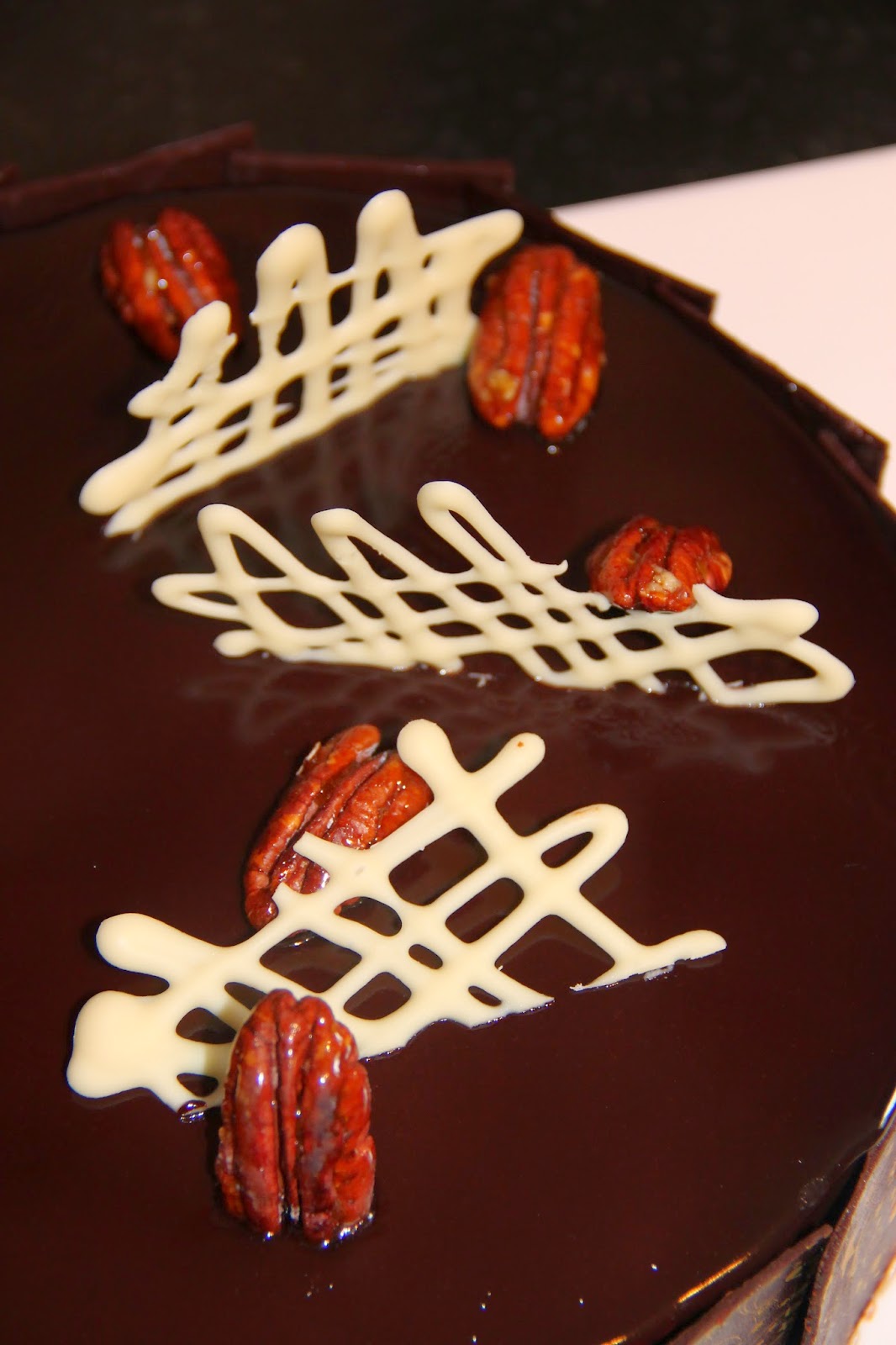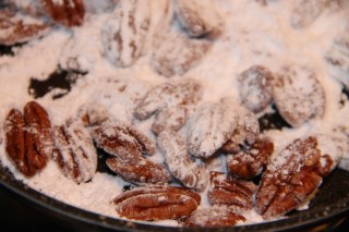 Dans une poêle, faire caraméliser en remuant sans cesse, 100 gr de noix de pécan et 100 gr de sucre glace. Quand les noix sont bien dorées, réserver sur un flexipan ou un papier sulfurisé.