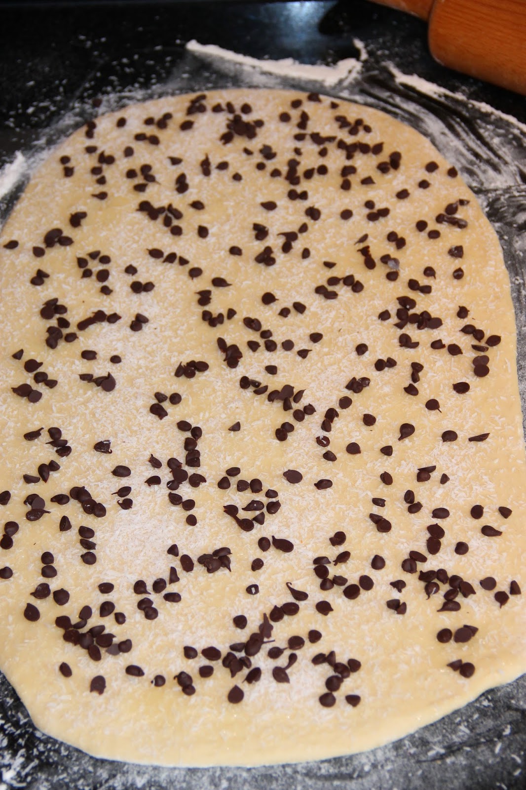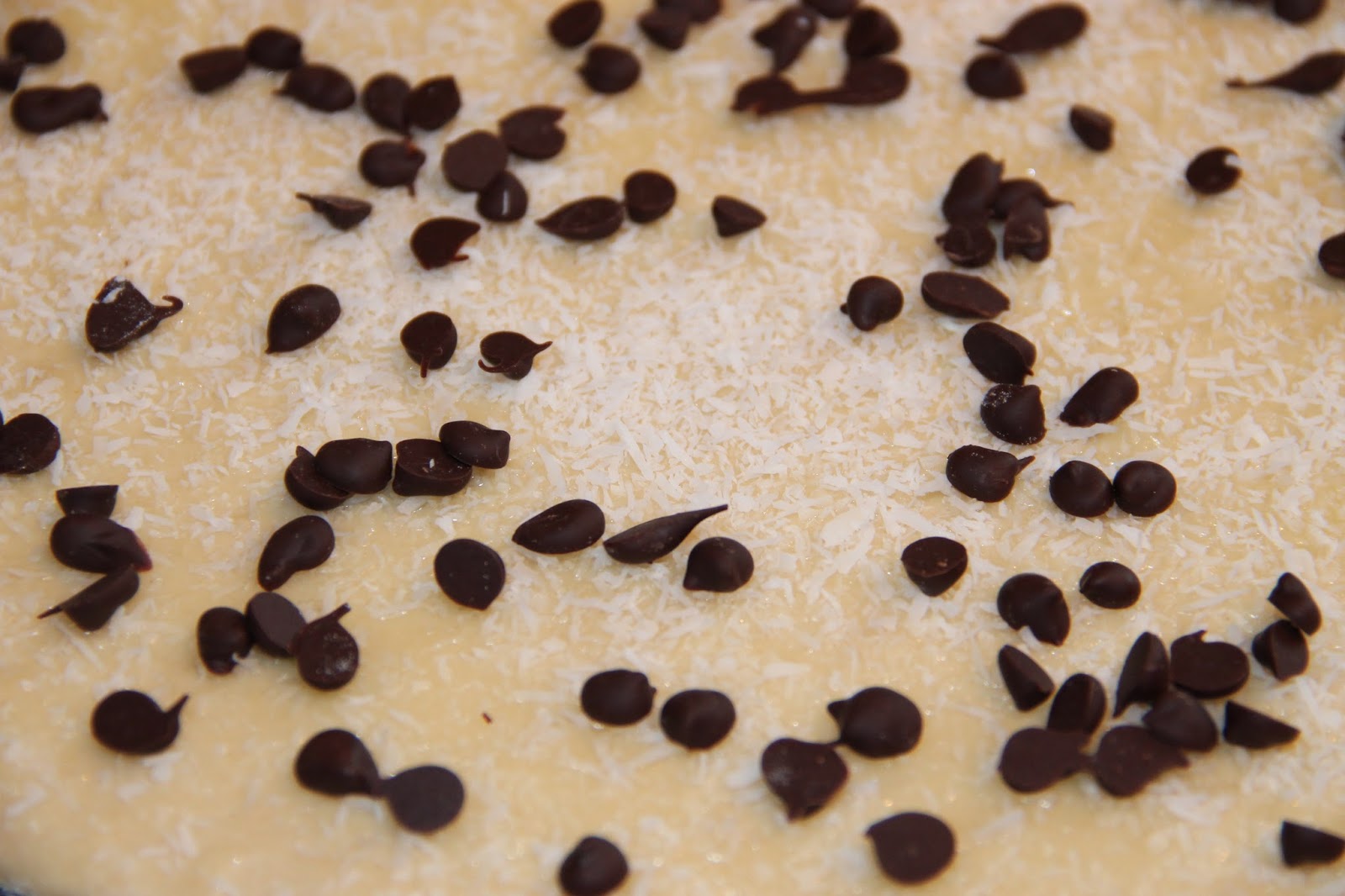 Badigeonner la pâte avec cette préparation. Saupoudrer de noix de coco en poudre et de pépites de chocolat.