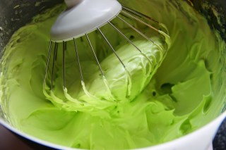 Dans un autre saladier, monter les blancs en neige avec une petite pincée de sel. Quand ils commencent à prendre, ajouter 75 gr de sucre, et le colorant alimentaire, et battre jusqu’à ce que la meringue forme des pics.
