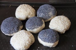 Façonner les boules de pains, les tremper à mi-hauteur dans un récipient d’eau puis dans un bol de graines, et les déposer sur une plaque allant au four en les espaçant.
