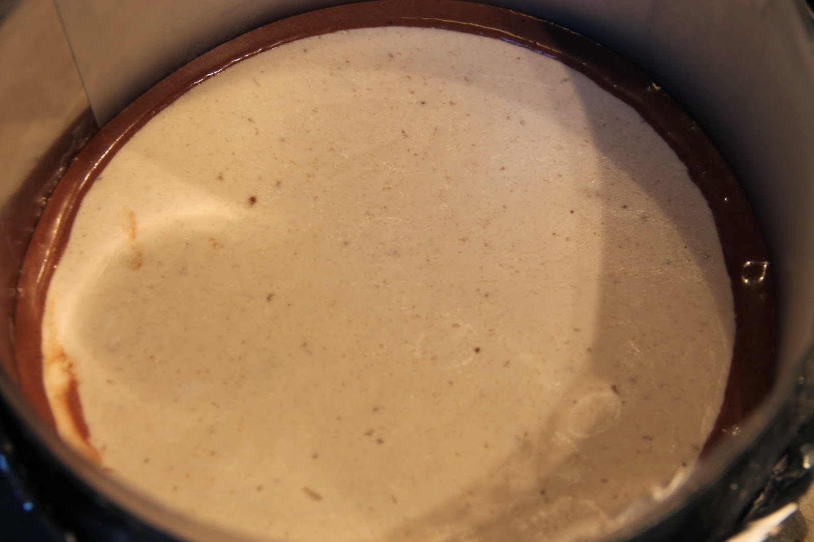 Verser le bavarois chocolat dans un cercle chemisé de rhodoïde de 20 cm de diamètre.