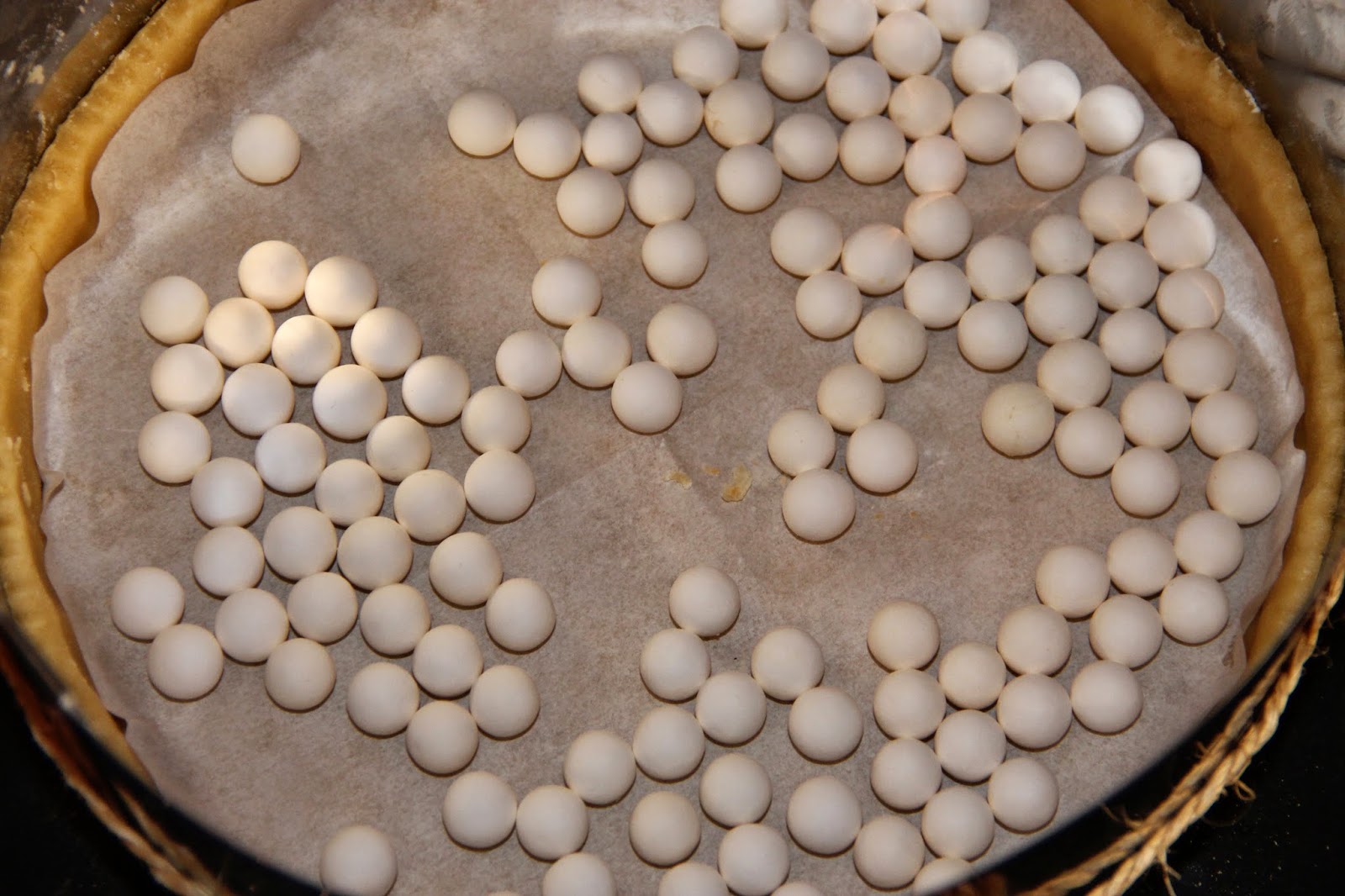 Abaisser la pâte sur un plan de travail fariné. Foncer le moule. Couvrir la pâte avec un papier sulfurisé et garnir de billes de céramique.