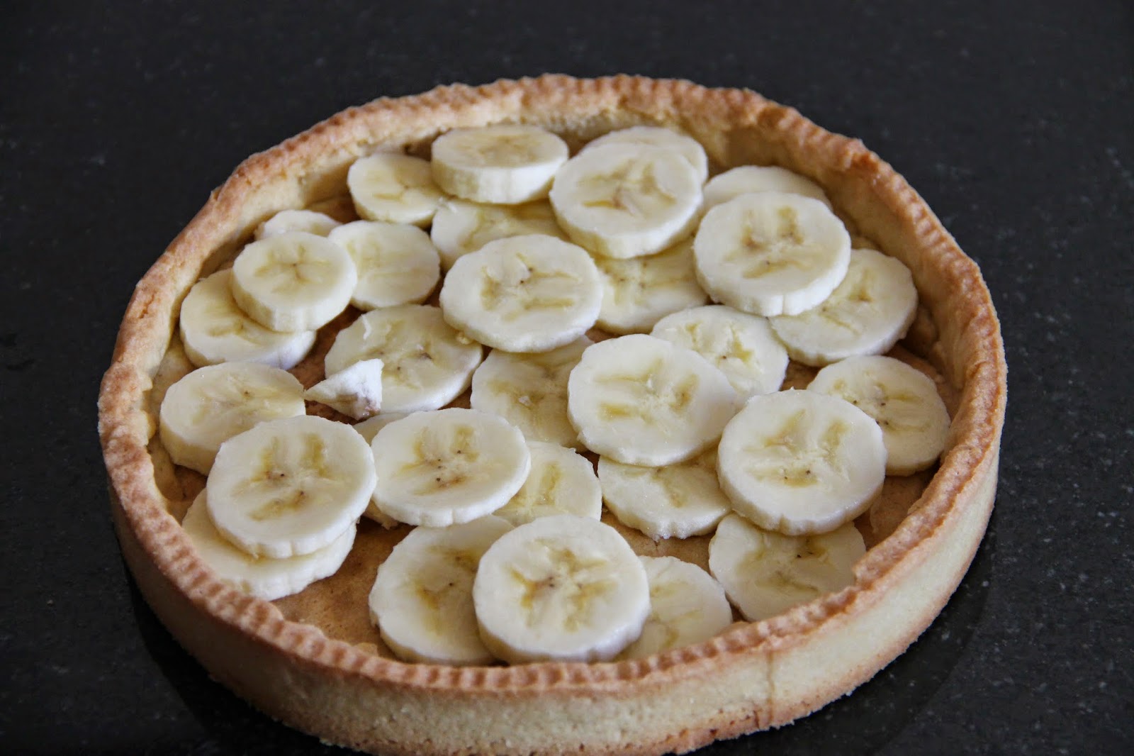 Mettre des rondelles de banane fraîche sur la pâte sablée puis déposer dessus l’entremet chocolat/banane. Décorer de chips de banane.