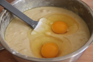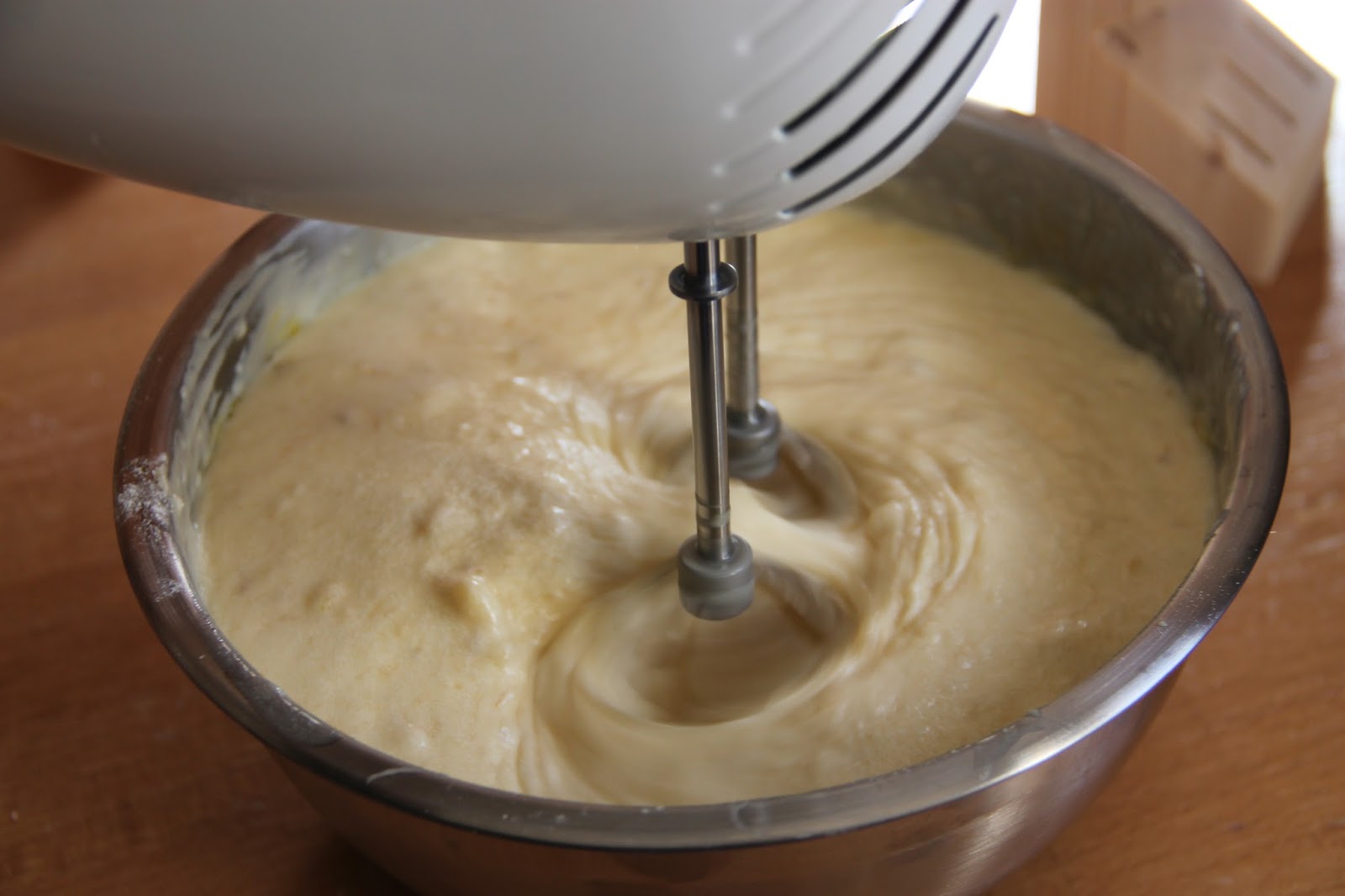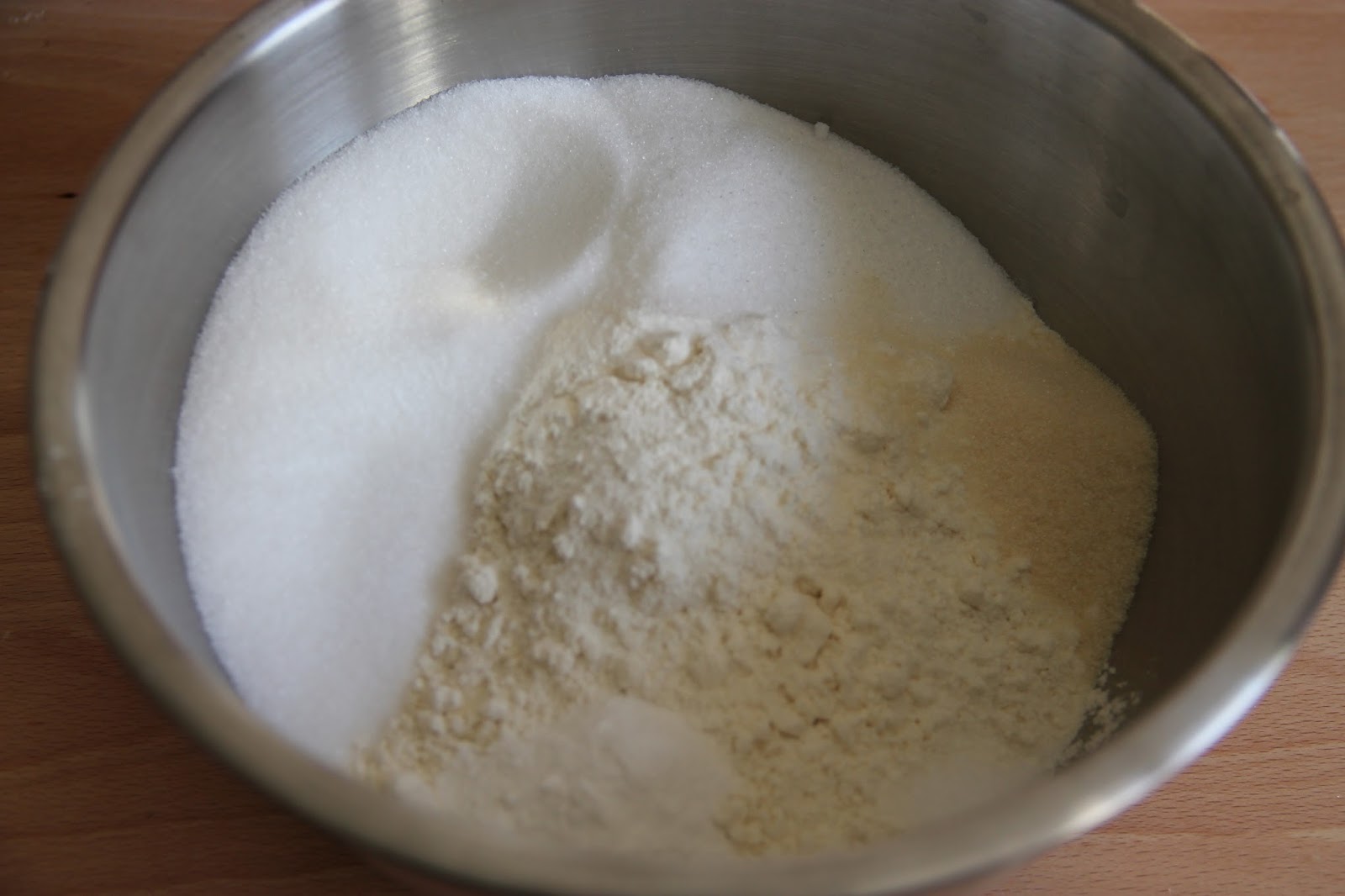 Mélanger dans un cul de poule, la farine, le sucre, le sucre vanillé, la levure et le sel.