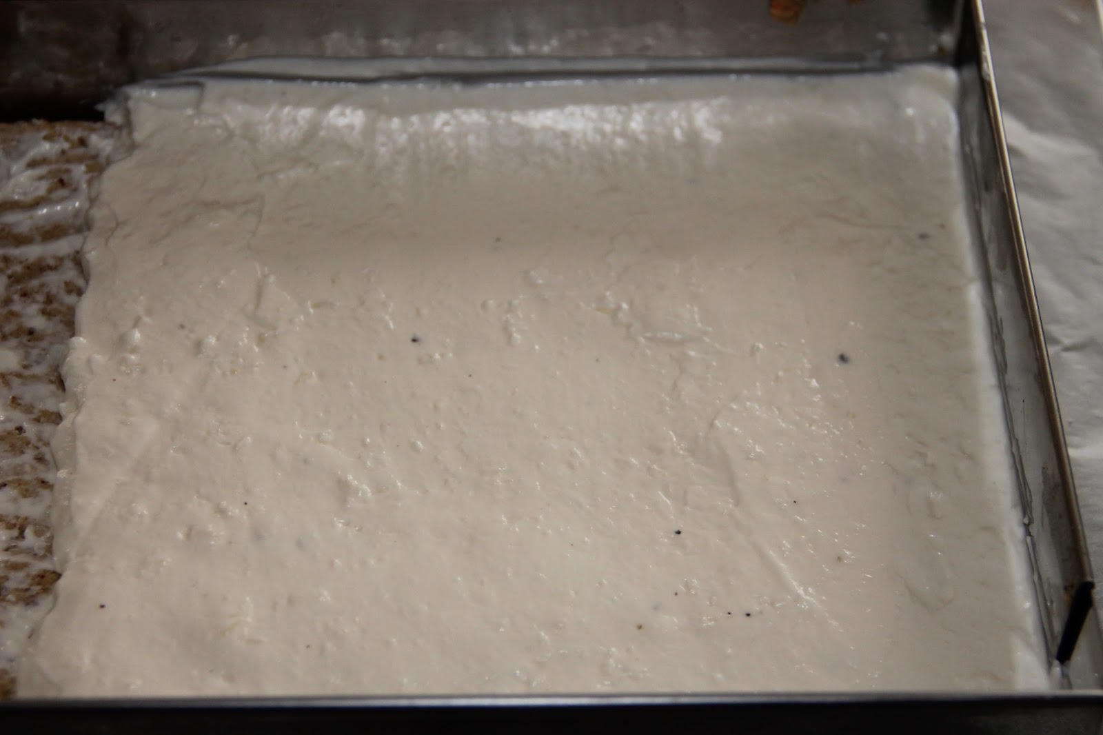 Verser sur le biscuit aux noisettes (en conserver deux cuillères à soupe) et placer 1/4 d’heure au congélateur.