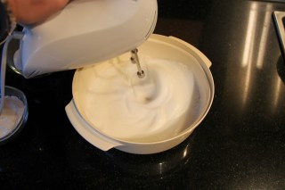 Monter les blancs en neige avec une pincée de sel. Quand ils commencent à prendre, ajouter progressivement 100 gr de sucre et battre en neige ferme. Quand ils sont bien fermes, les serrer avec les 25 gr de sucre restants.