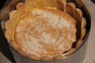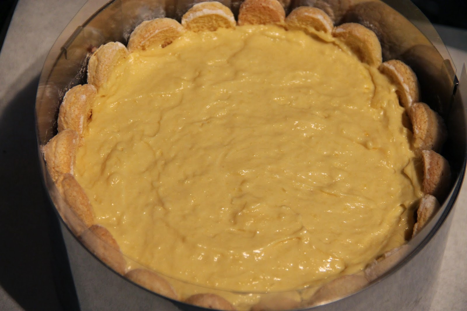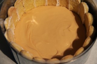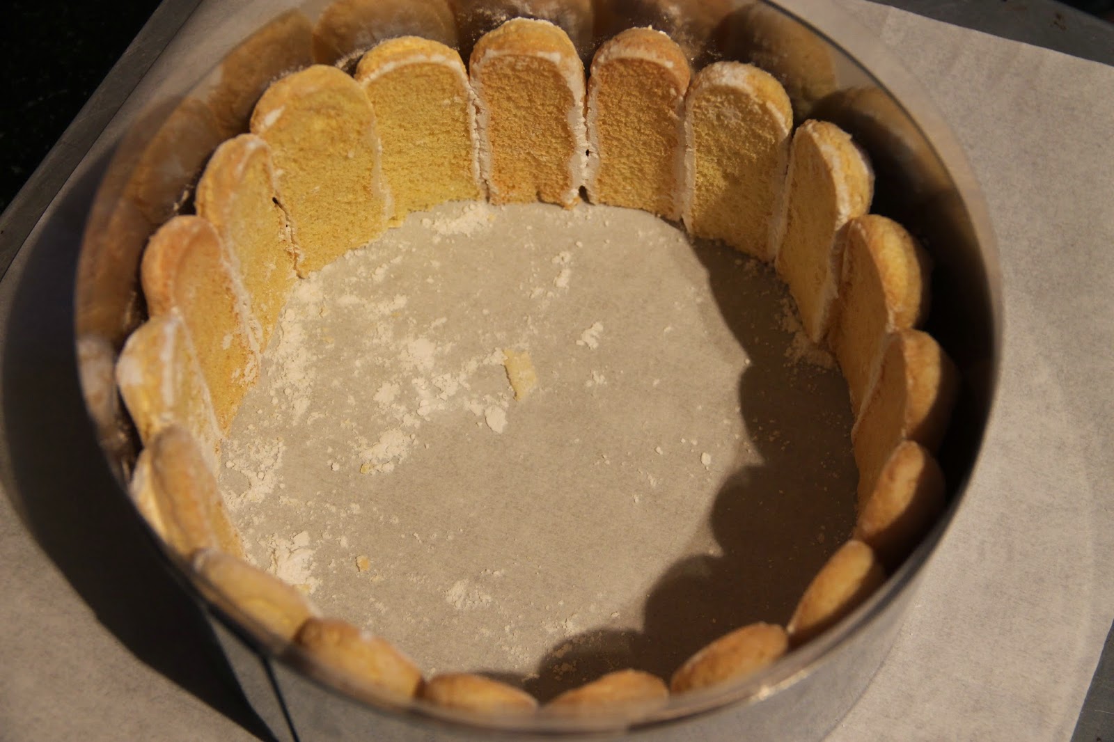 Couper les bases des biscuits à la cuillère afin que leur longueur exacte soit de 7 cm et disposer les contre le cercle en les serrant bien.