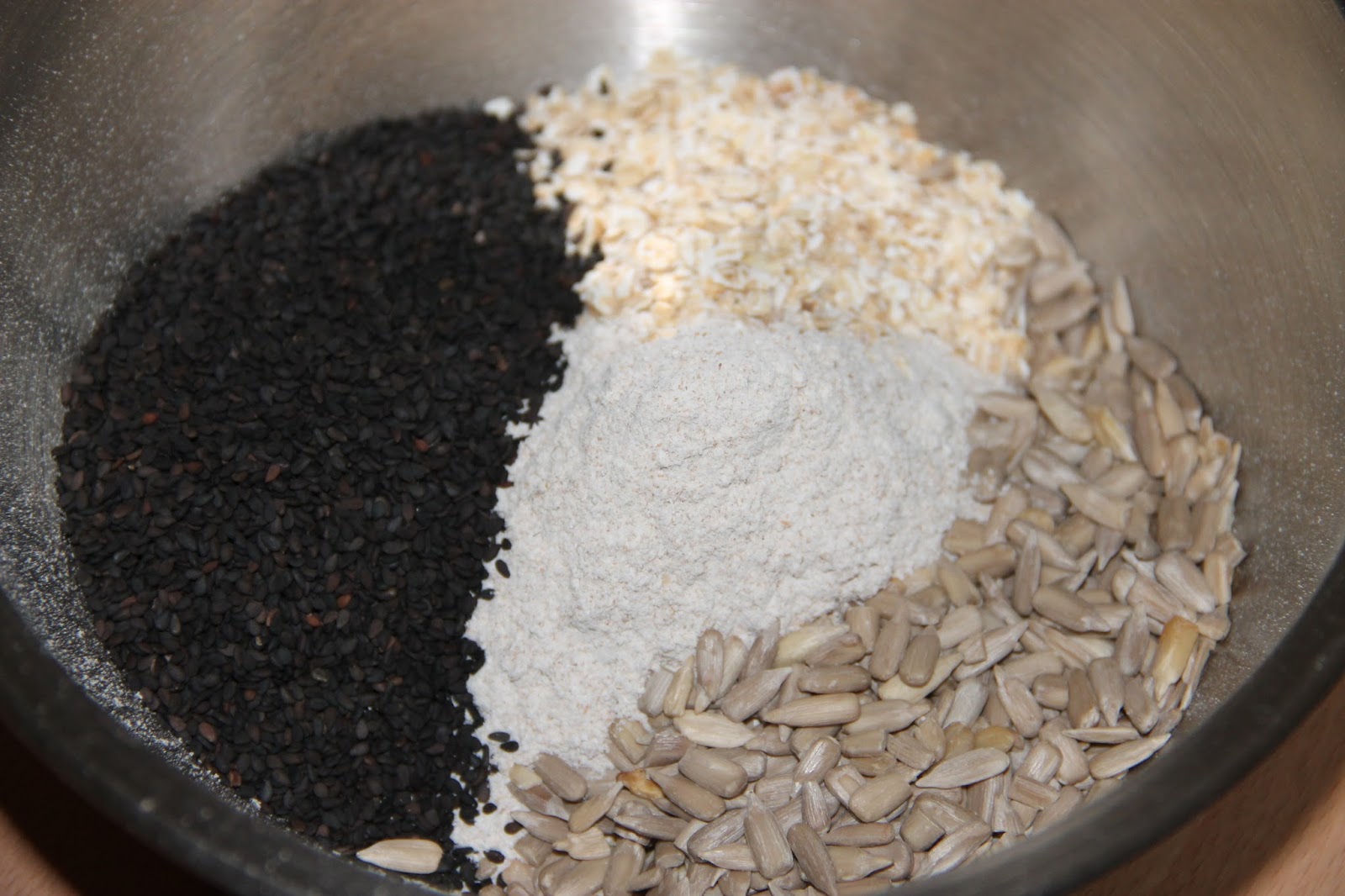 Dans un cul de poule, mettre la farine de seigle, les flocons d’avoine, les graines de sésame et tournesol, la fleur de sel et le bicarbonate.