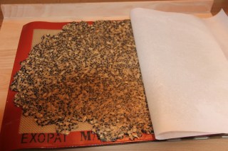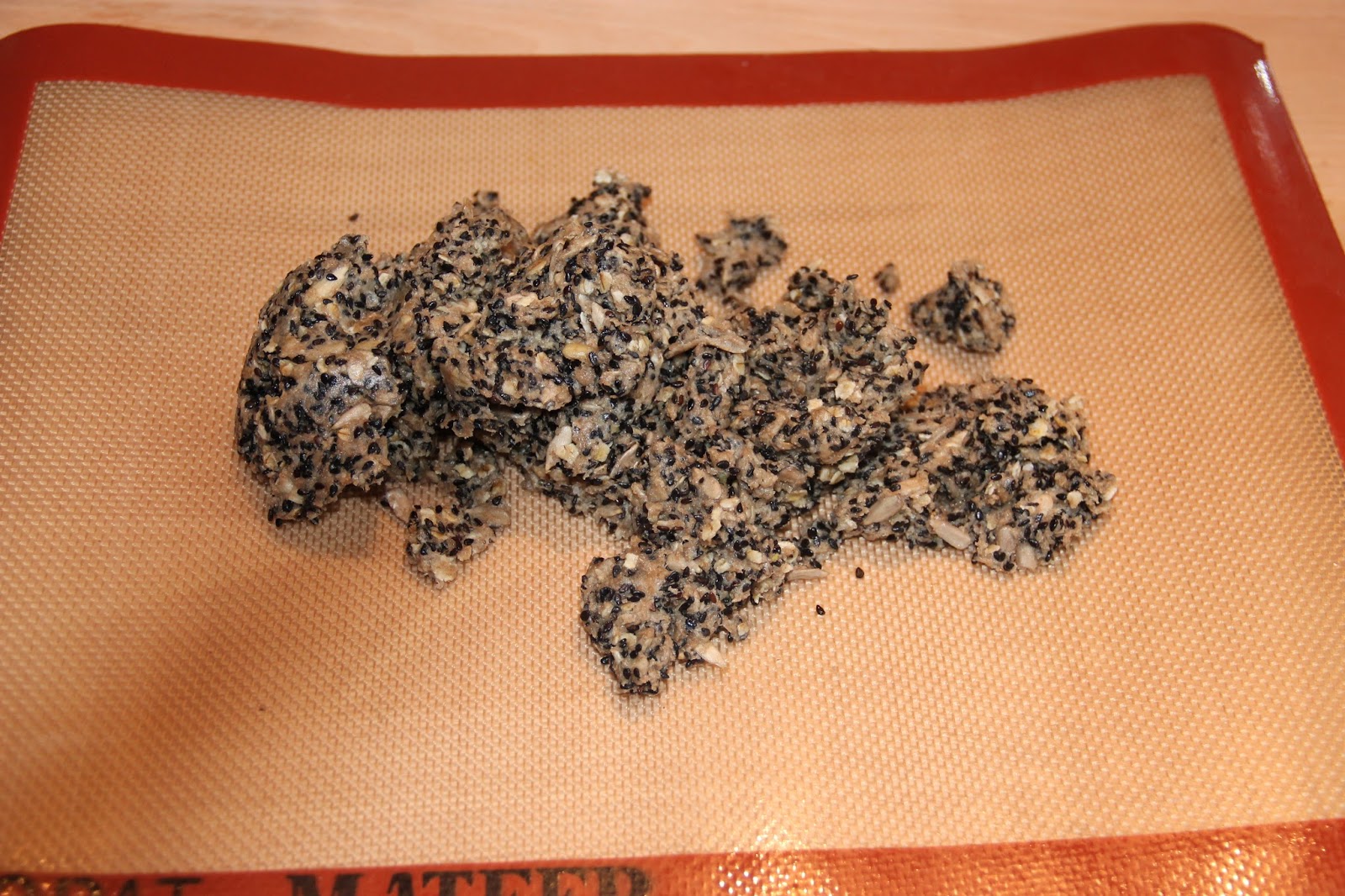 Mélanger tous les ingrédients et les verser sur une plaque de silicone ou à défaut une plaque recouverte de papier sulfurisé.