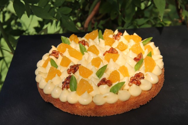 Décorer de morceaux de suprêmes d’orange, de noix et de feuilles de basilic.