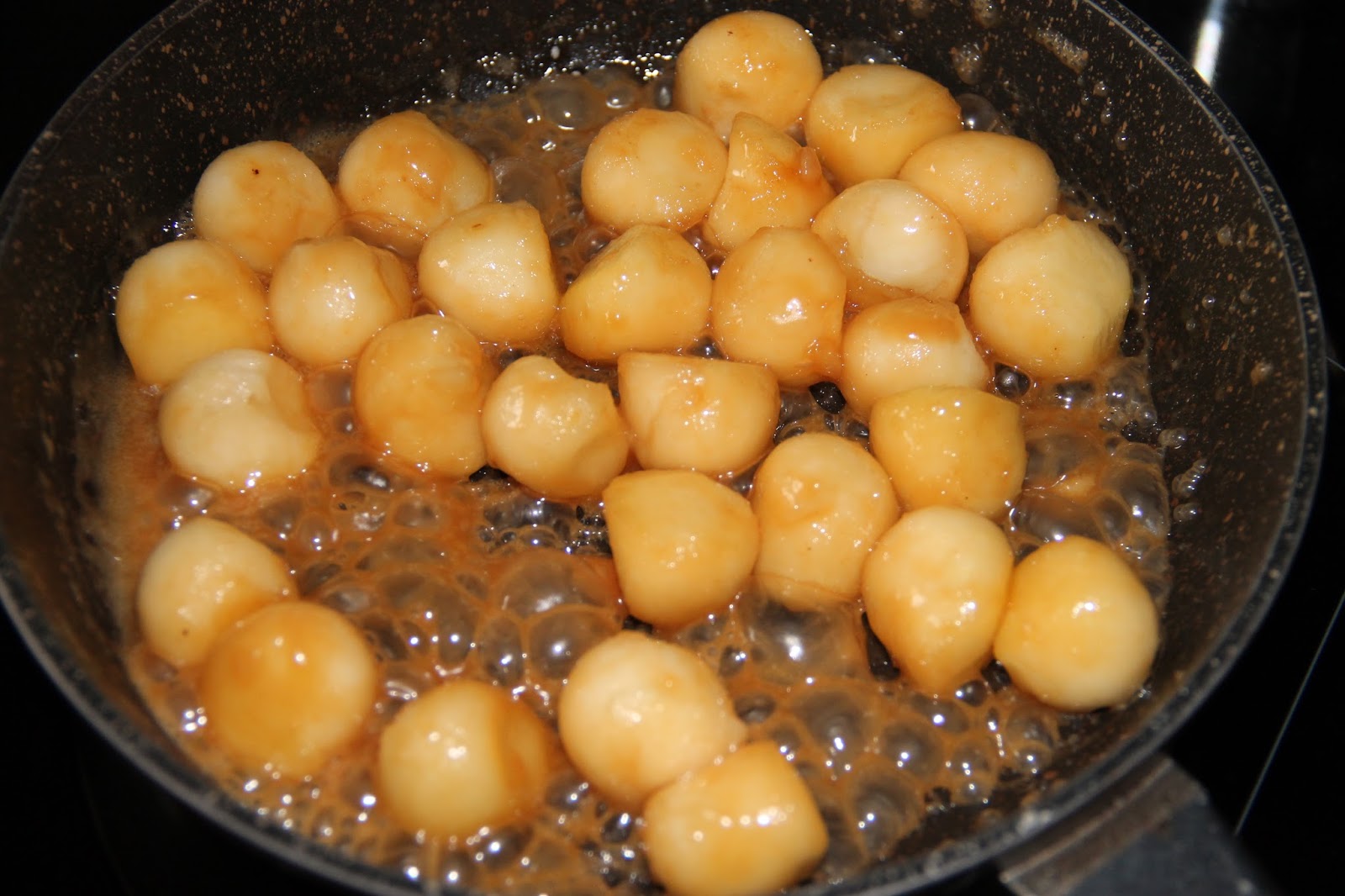 Mettre les billes de pomme dans une poele avec le caramel et faire cuire 3 min. Réserver.