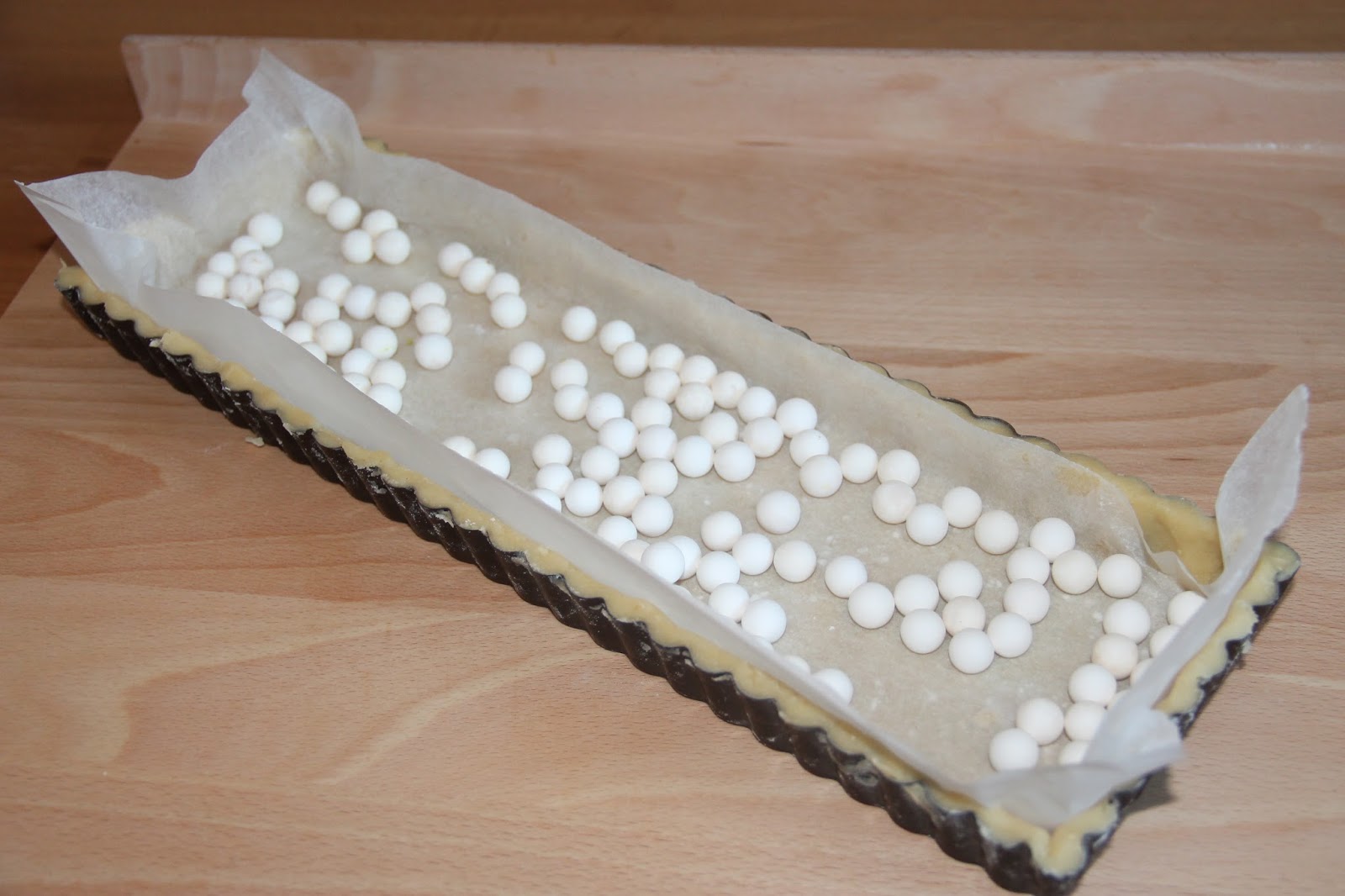 Couvrir la pâte de papier sulfurisé et de billes de céramique ou à défaut de haricots secs.