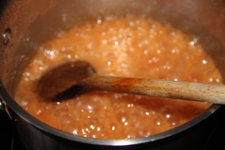 Dans une seconde casserole faire un caramel doré avec le sucre. Décuire le caramel avec la première préparation et porter à ébullition pendant une minute. Réserver.