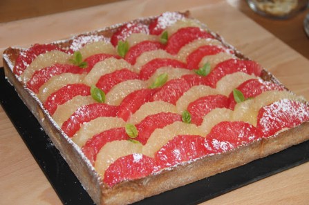 Décorer de suprêmes de pamplemousses roses et jaunes et décorer de pistache ou de feuille de basilic comme ici.