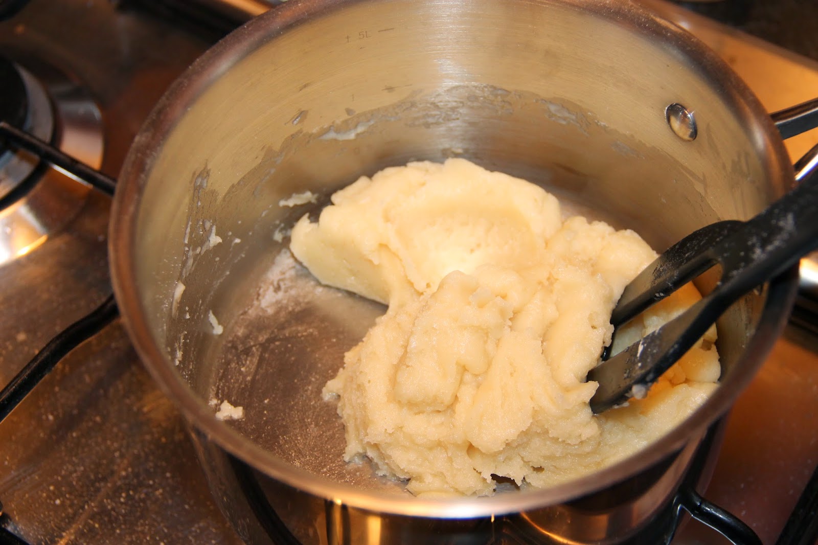 Remettre la casserole sur le feu et remuer énergiquement durant 2 minutes sans discontinuer jusqu’à ce que la pâte soit bien lisse et se décolle des parois de la casserole.