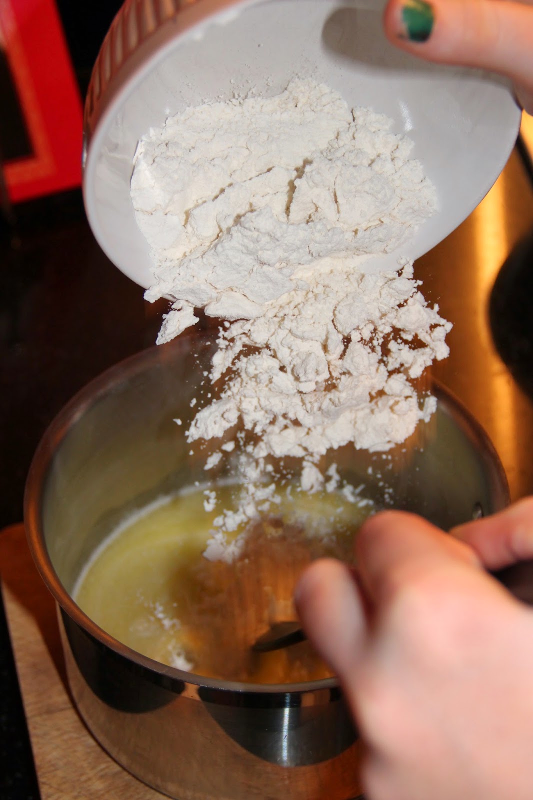Dès le premier bouillon, retirer la casserole du feu et verser la farine en pluie tout en remuant durant 30 secondes afin de dessécher la pâte.