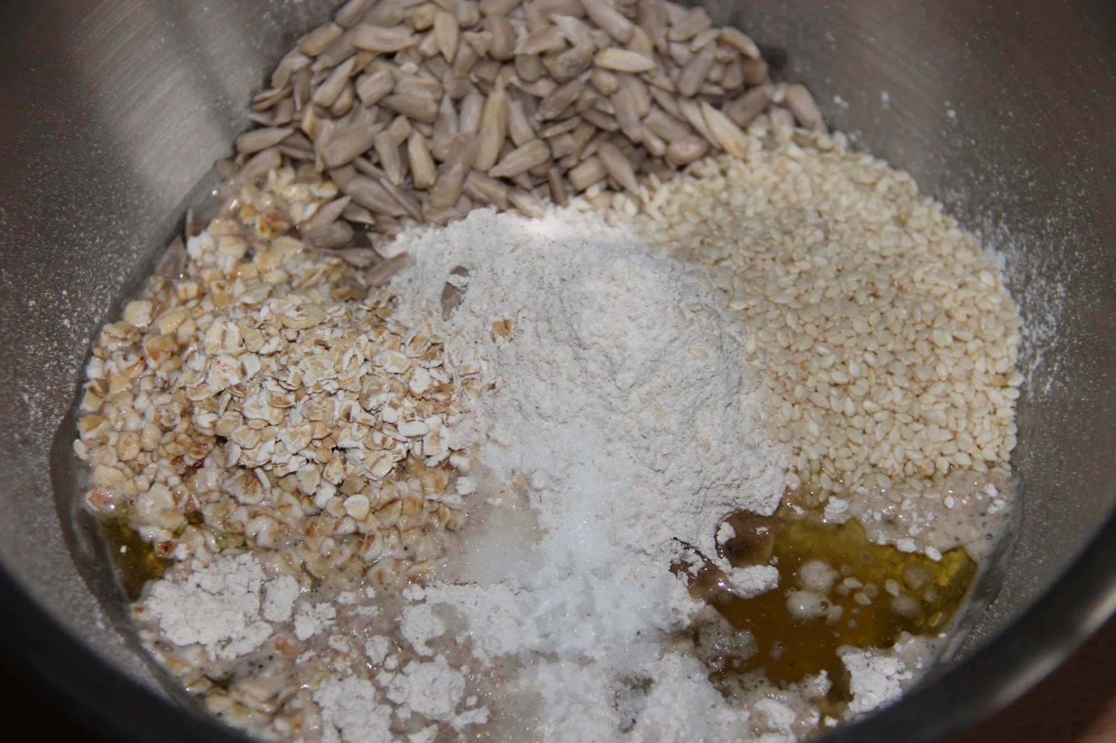 Dans un cul de poule, mettre la farine de seigle, les flocons d’avoine, et les graines de sésame blond, la fleur de sel et le bicarbonate.