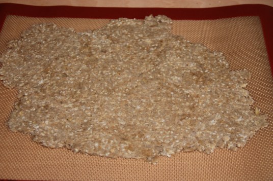 Mélanger tous les ingrédients et les verser sur une plaque de silicone ou à défaut une plaque recouverte de papier sulfurisé.