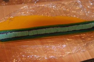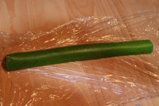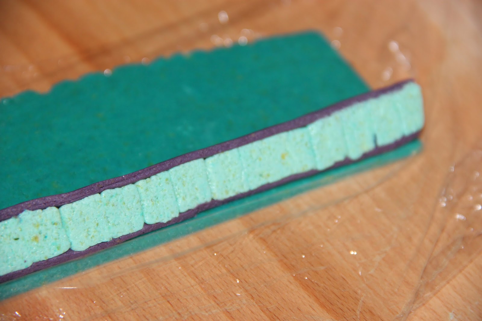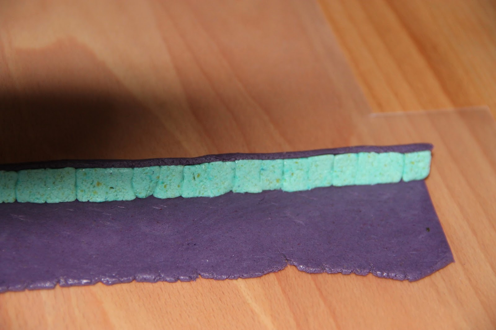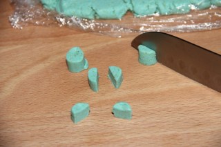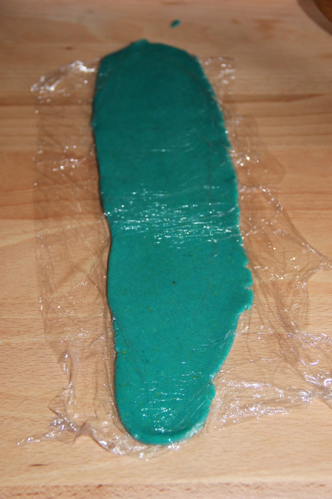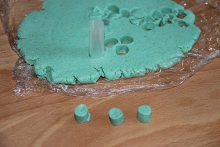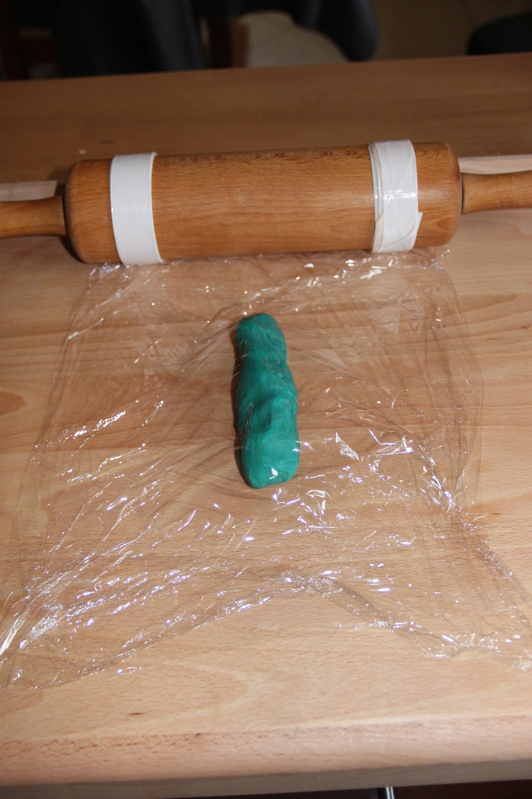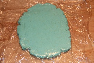 Etaler le pâton turquoise entre deux films alimentaire sur une épaisseur de 1 cm.