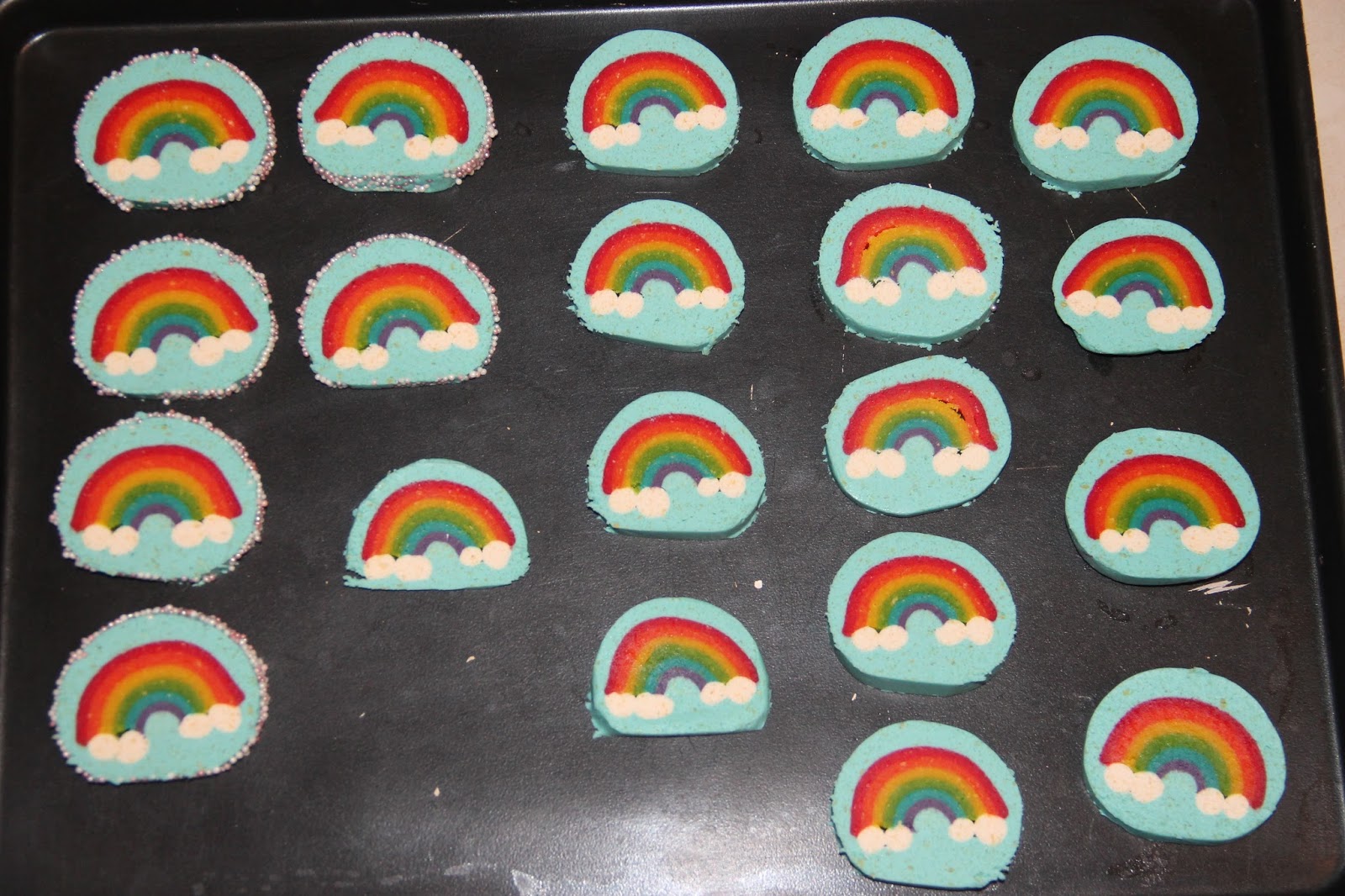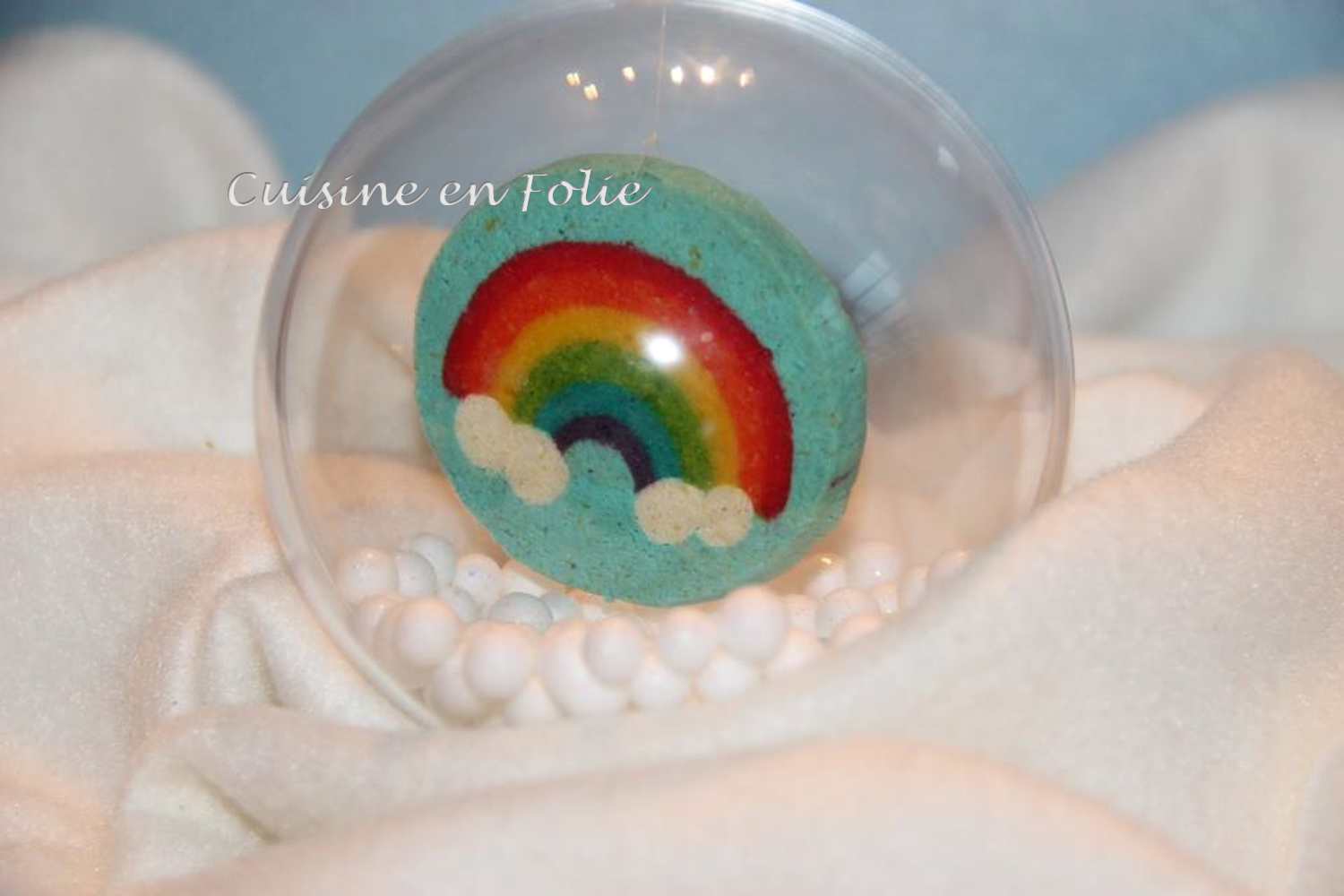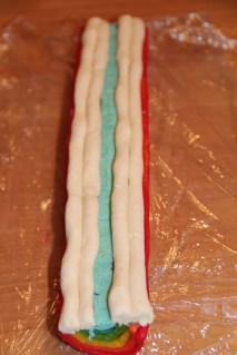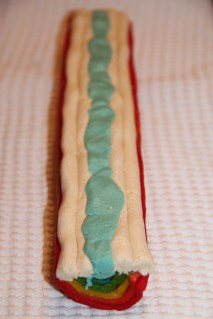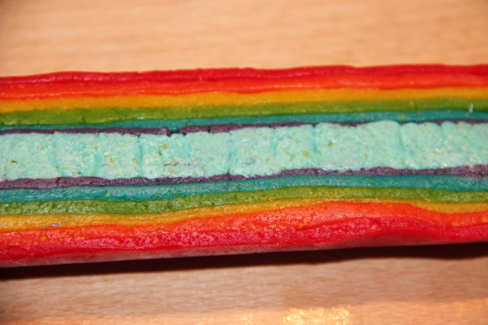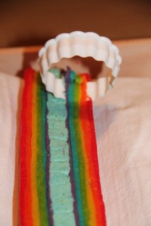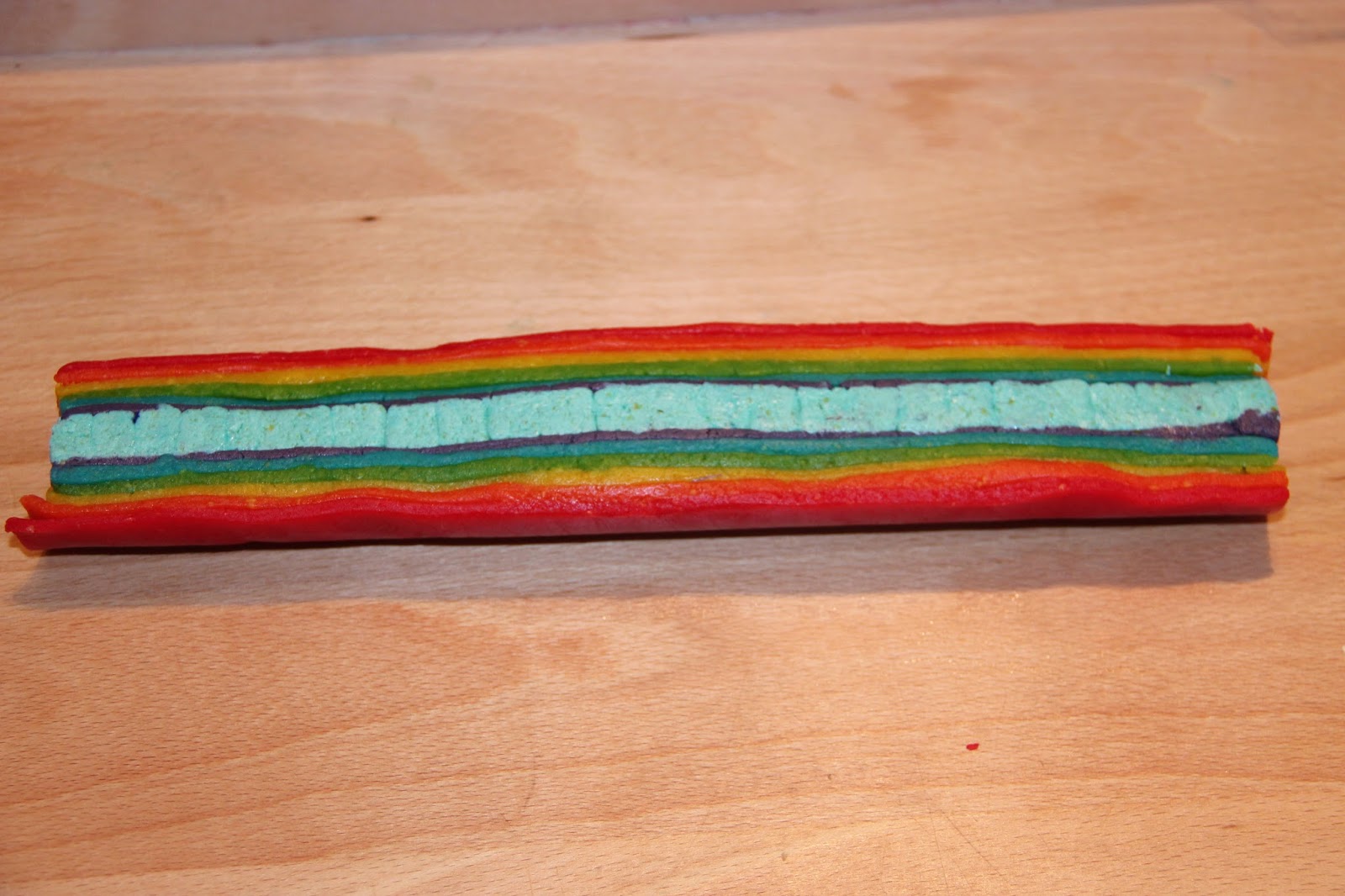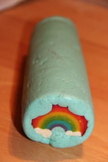 Appliquer le reste de pâte turquoise autour de l’arc-en-ciel, et rouler délicatement sur un plan de travail pour uniformiser la pâte.