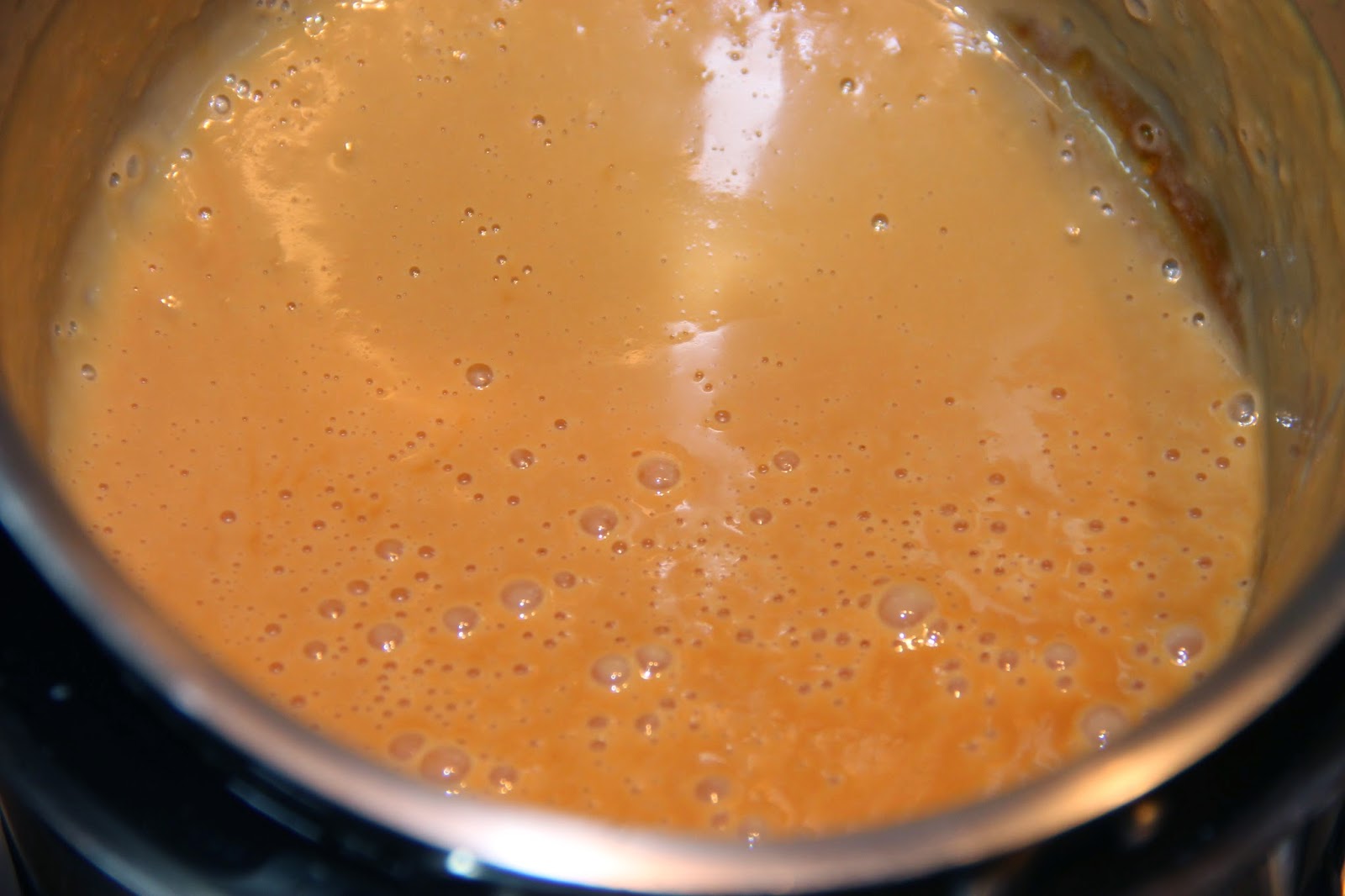 Ajouter la gélatine essorée, puis verser sur le caramel et porter le tout sur feu doux sans cesser de remuer à 82 °C.