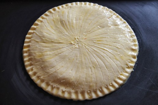 Badigeonner la galette au pinceau avec un oeuf battu .