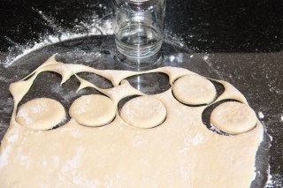 Fariner le plan de travail. Etaler la pâte sur une épaisseur de 1 cm et découper des ronds à l’aide d’un verre.