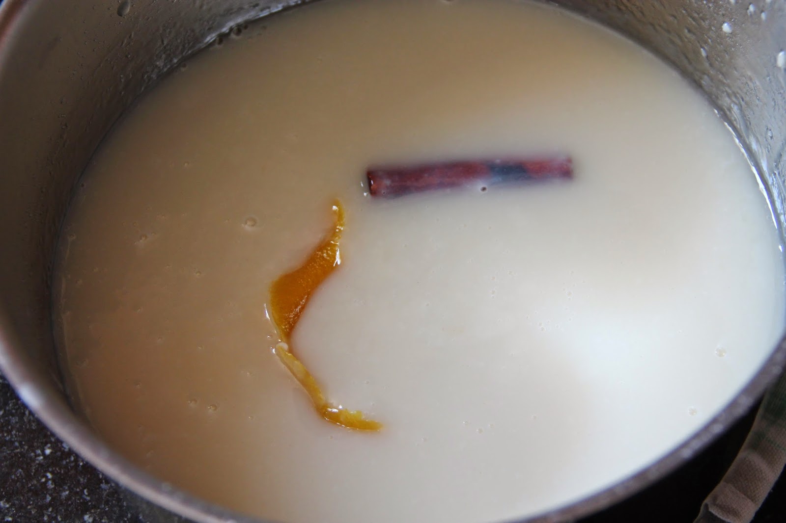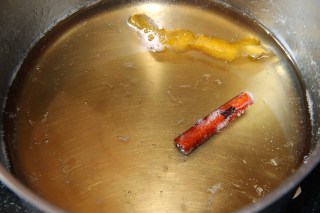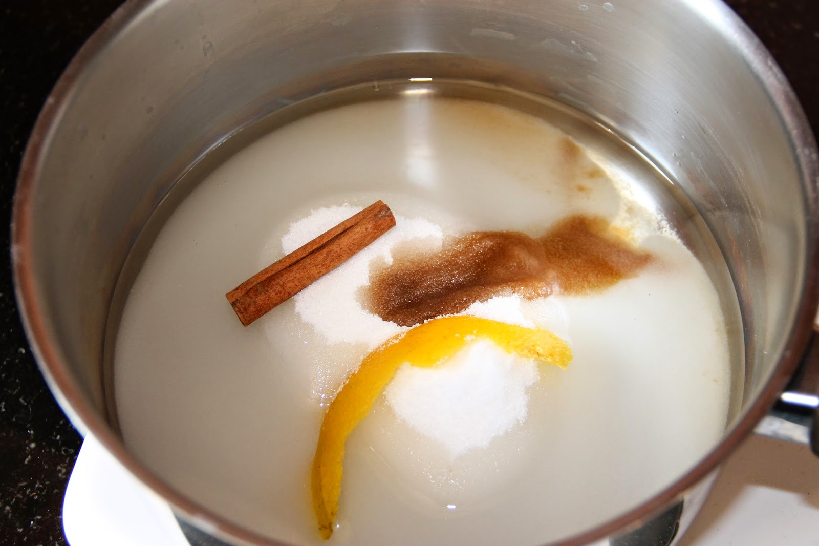 Dans une casserole, mettre le sucre, le sel, la cannelle, la vanille, l’eau et un morceau de peau de citron non traité, sans le blanc.