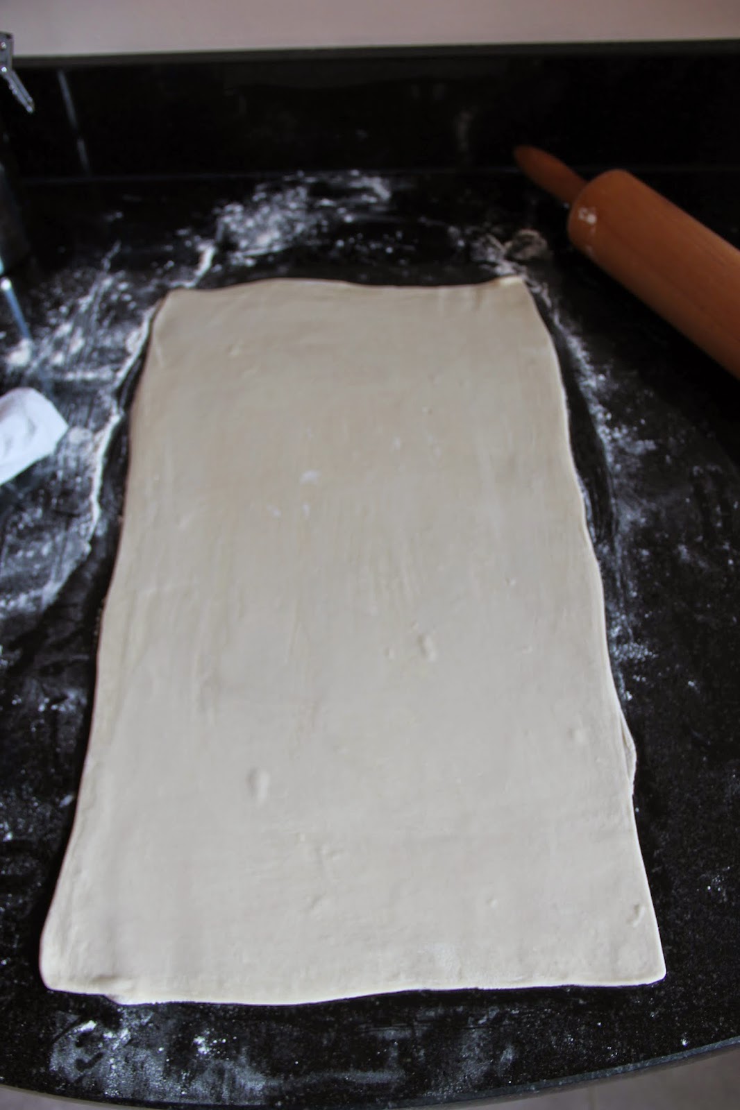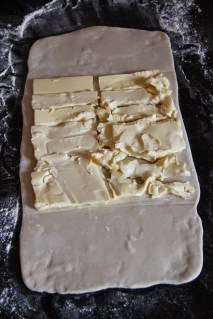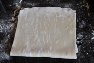 Tourner la pâte de 90°, puis étaler de nouveau en un rectangle 3 fois plus long que large.