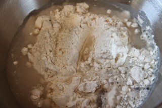 Mettre la farine dans la cuve du batteur et ajouter les 140 ml d’eau.
