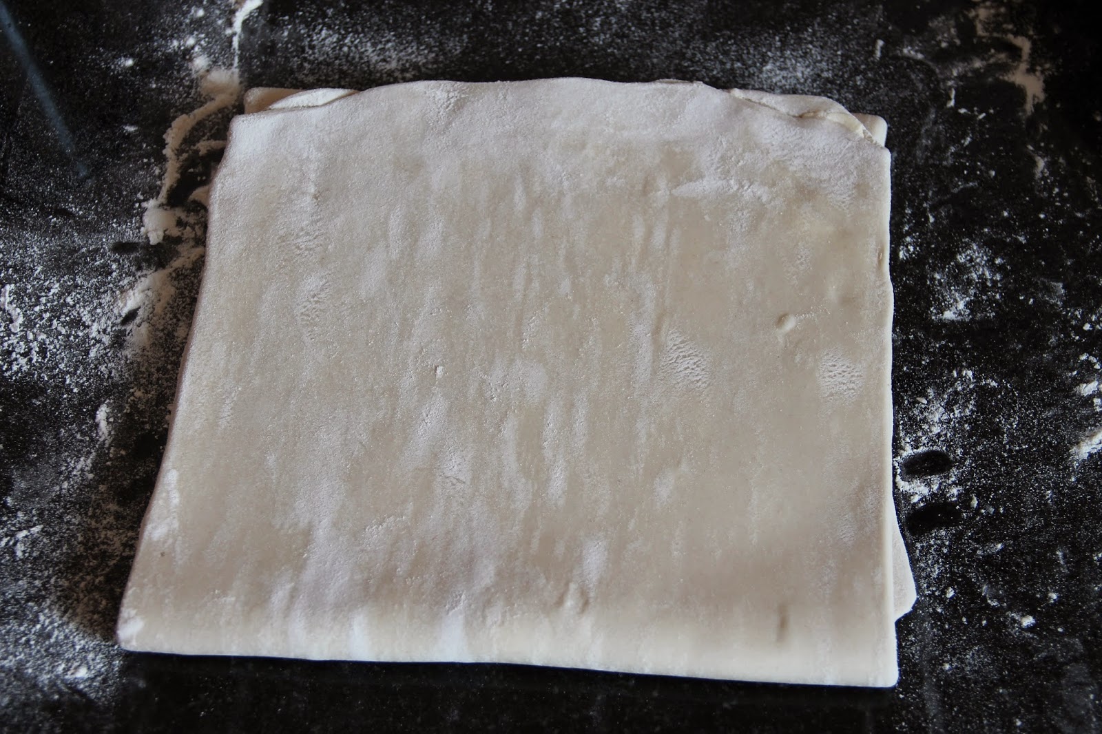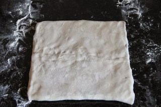 Plier de nouveau en 3. Tourner encore une fois la pâte sur 90° puis étaler la pâte en un rectangle de 3 mm d’épaisseur.