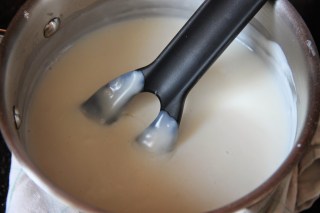 Dans une casserole, mettre la farine et y incorporer petit à petit le lait. Porter à ébullition à feu doux sans cesser de remuer et couper au premier bouillon.