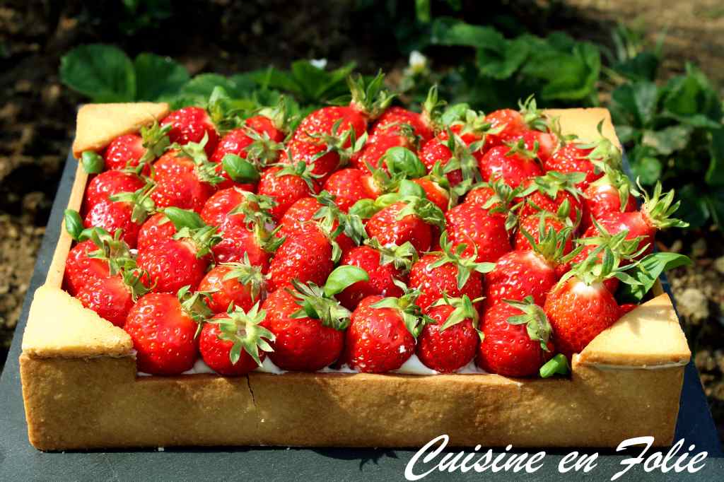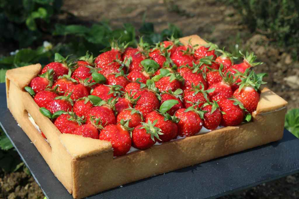 Concernant ma tarte aux fraises, j’ai choisi de la monter sur une pâte sucrée garnie de crème d’amande, et sous les fraises, une ganache montée au basilic qui est une pure dinguerie !!! Pour les fraises, soyons chauvins, de bonnes fraises françaises mures et parfumées à souhait et vous allez vous envoler à chaque bouchée !!!