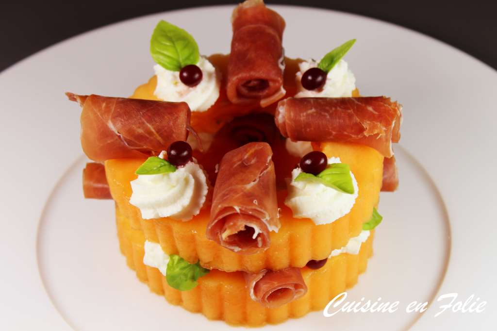 Un bon melon, du jambon de serano, la crème, je l’ai imaginée au chèvre, et pour la décoration, quelques feuilles de basilic, et ma petite touche personnelle, des perles végétales au porto Ruby de mon amie Yana.